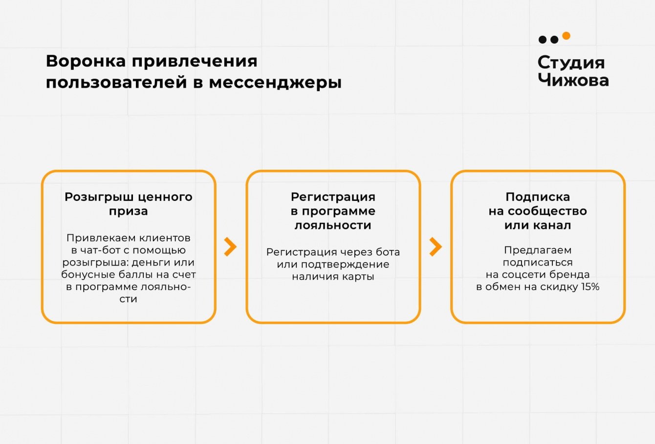 Изучив данные исследования, мы выстроили новую стратегию, которая предполагает интеграцию соцсетей и программы лояльности с помощью чат-бота. Сначала привлекаем аудиторию в рассылку, затем ведем ее в программу лояльности, а потом при помощи контента и рассылки работаем над увеличением продаж.