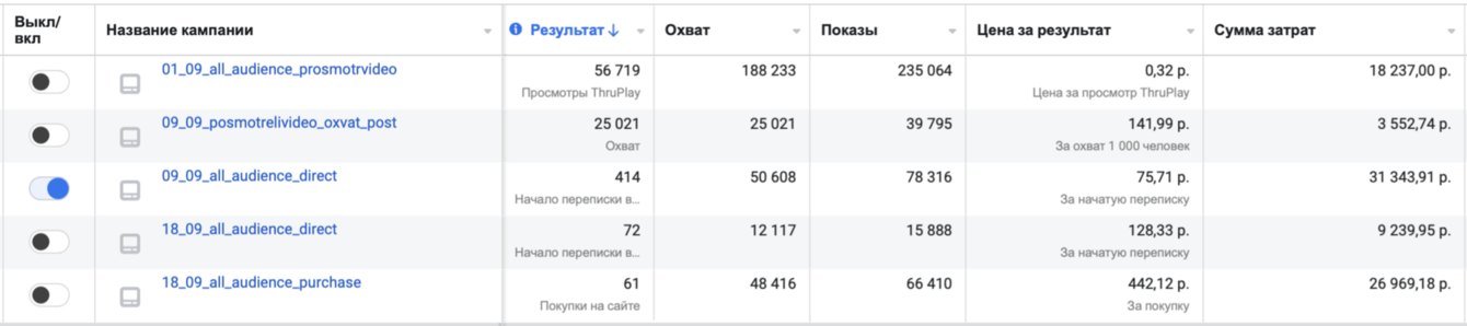 После анализа кампаний с целью "просмотр видео" было выявлено, что больше всего взаимодействий приходится из плейсмента Instagram, на втором месте — Facebook. Эти плейсменты мы и решили использовать в новых рекламных кампаниях с целью "сообщения в директ" и "заявки с сайта". Также анализ объявлений помог определиться с рабочими форматами креативов и текстов.