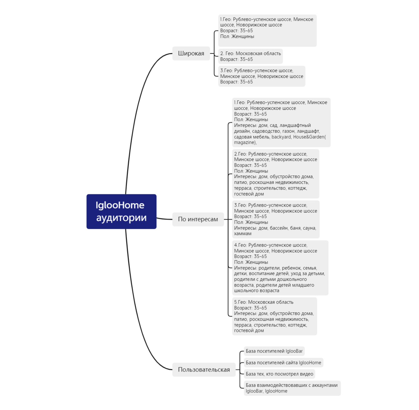 Так как в IGLOO есть концепция детской игровой, мы подобрали следующие интересы: родители, воспитание детей, уход за детьми, семья, детки, ребенок, родители детей младшего школьного возраста, родители с детьми дошкольного возраста.