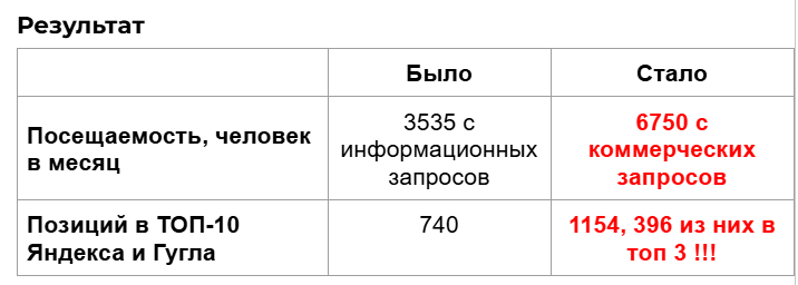 На момент старта в Яндексе и Гугле было 740 запросов в топ10 , после нашей работы их стало 1154 в топ10, причем 396 из них - на первых местах! ?