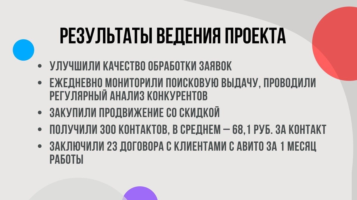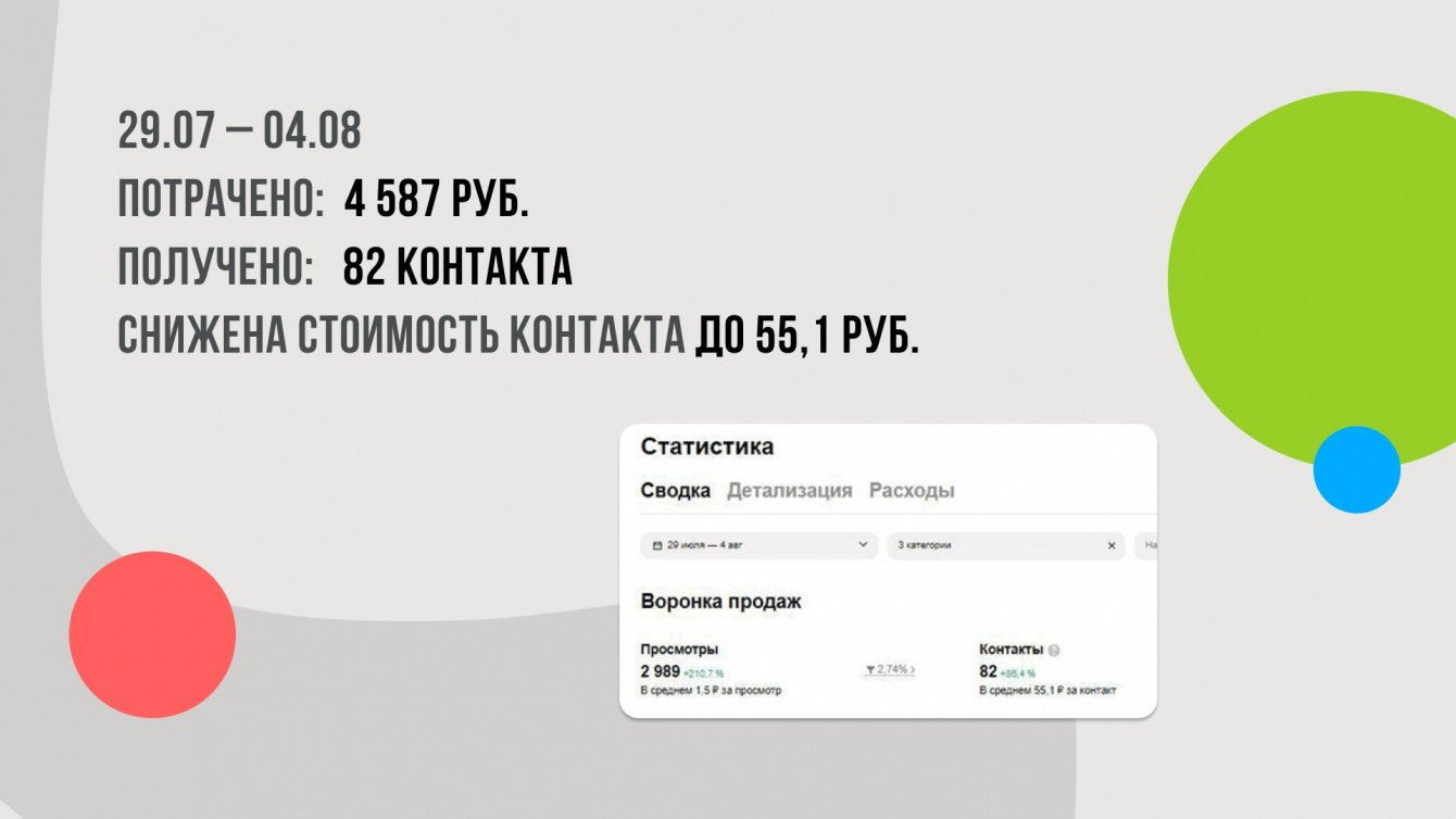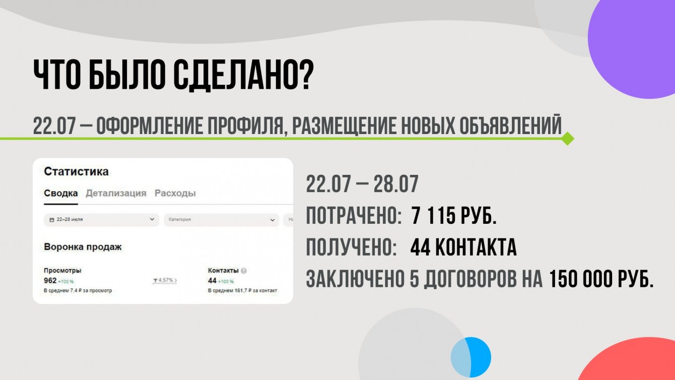 В результате анализа после первой недели работы выявили, что наши объявления собирают гораздо больше просмотров. У конкурентов 20-30, у нас – 100 просмотров на одно объявление, где стоит продвижение. Поэтому подключили ежедневное продвижение наиболее успешных объявлений с высокой конверсией.