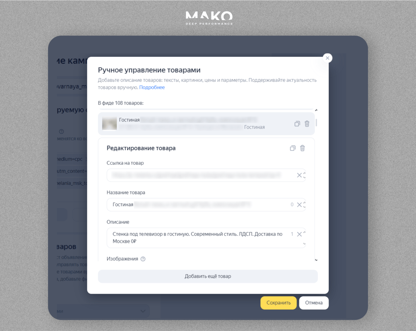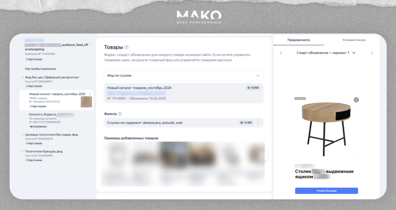 Сделали простой ручной фид в интерфейсе Директа. Вручную собрали карточки, прописали тексты, загрузили картинки, прописали категорию. Плюс этого формата в том, что его можно собрать легко и быстро. Такое костыльное решение хорошо подходило фабрике, вот почему: