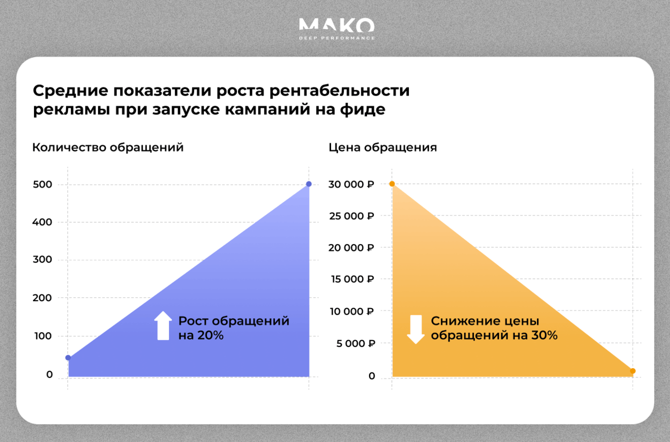 Мы рекомендуем рекламные кампании с фидом практически всем. И такую стратегию реализуем на проектах наших клиентов. Это хорошая точка роста, которая может принести на 20%+ больше обращений и снизить их стоимость на 30%+.