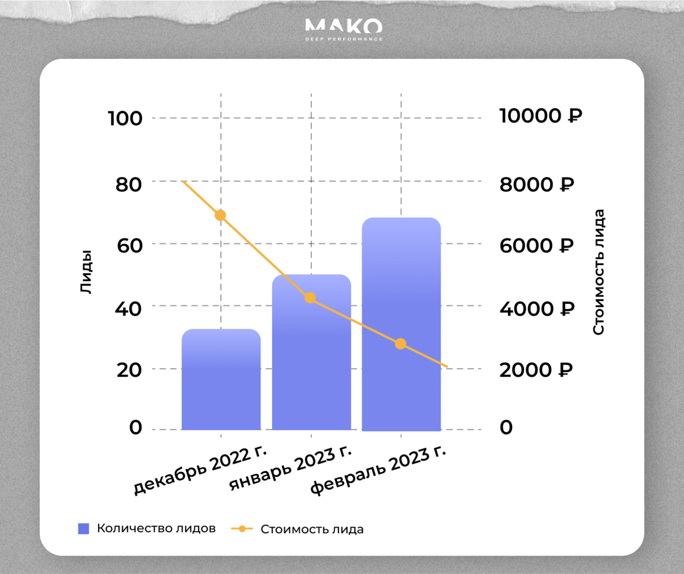 Сравните показатели декабря 2022 г., когда реклама велась по динамическому фиду, и статистику января-февраля 2023 г, когда мы начали работу и запустили в работу ручной фид. В феврале количество лидов повысили в 2 раза, а стоимость лида (CPA) снизили с 7 240 р. до 3 391 р.