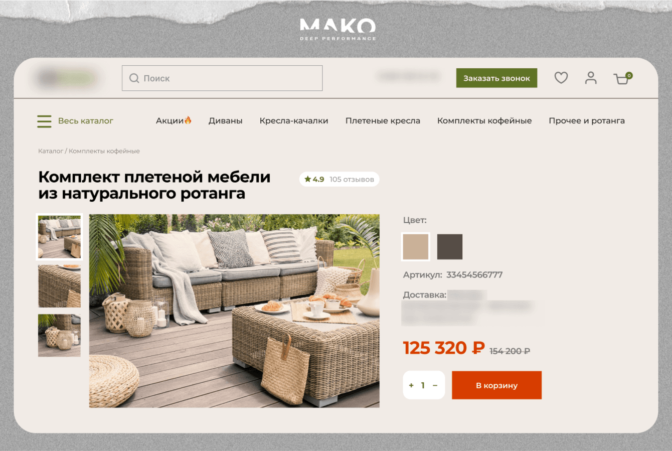 - После перехода на сайт пользователи попадали на карточку товара и в 99,8% случаев покидали ее, ничего не купив. В В2С товарах массового спроса покупателю нужен большой ассортимент. Например, пользователь искал в интернете комплект мебели из ротанга. Он еще не определился, какую именно модель хочет купить, какого цвета и фактуры должна быть обивка, какой вид плетения будет лучше смотреться. Попадание на карточку одного товара ограничивало возможности его выбора.