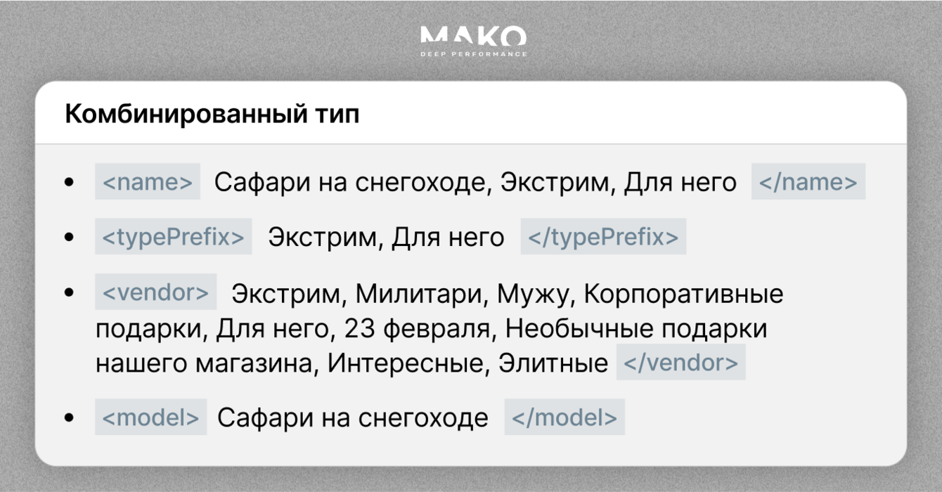 Вот какие элементы названия товара использовали в комбинированном типе фида по категории «сафари на снегоходе»: