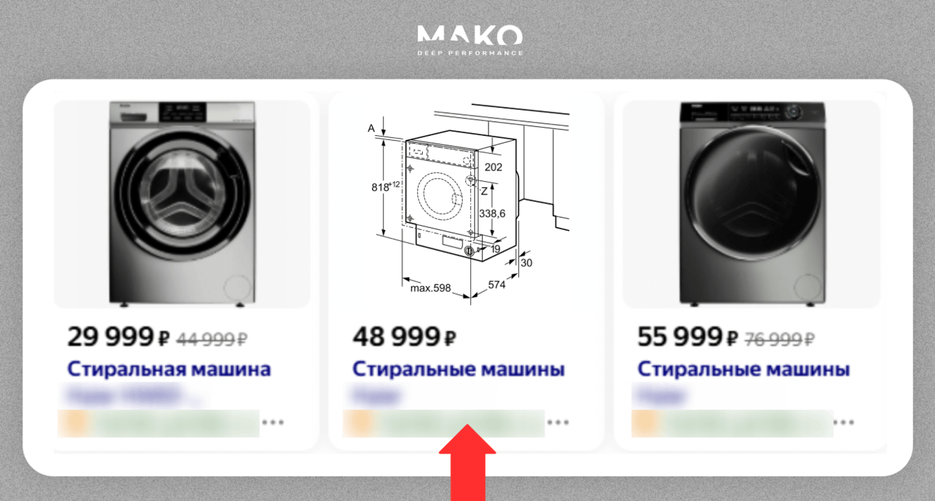 2. Непривлекательные иллюстрации. Например, в карточке стиральной машины на сайте было 3 фото, и одно из них — схема встройки. Алгоритмы подбирали для объявления рандомную картинку и демонстрировали пользователю не красивую фотографию новой техники, а скучную схему.