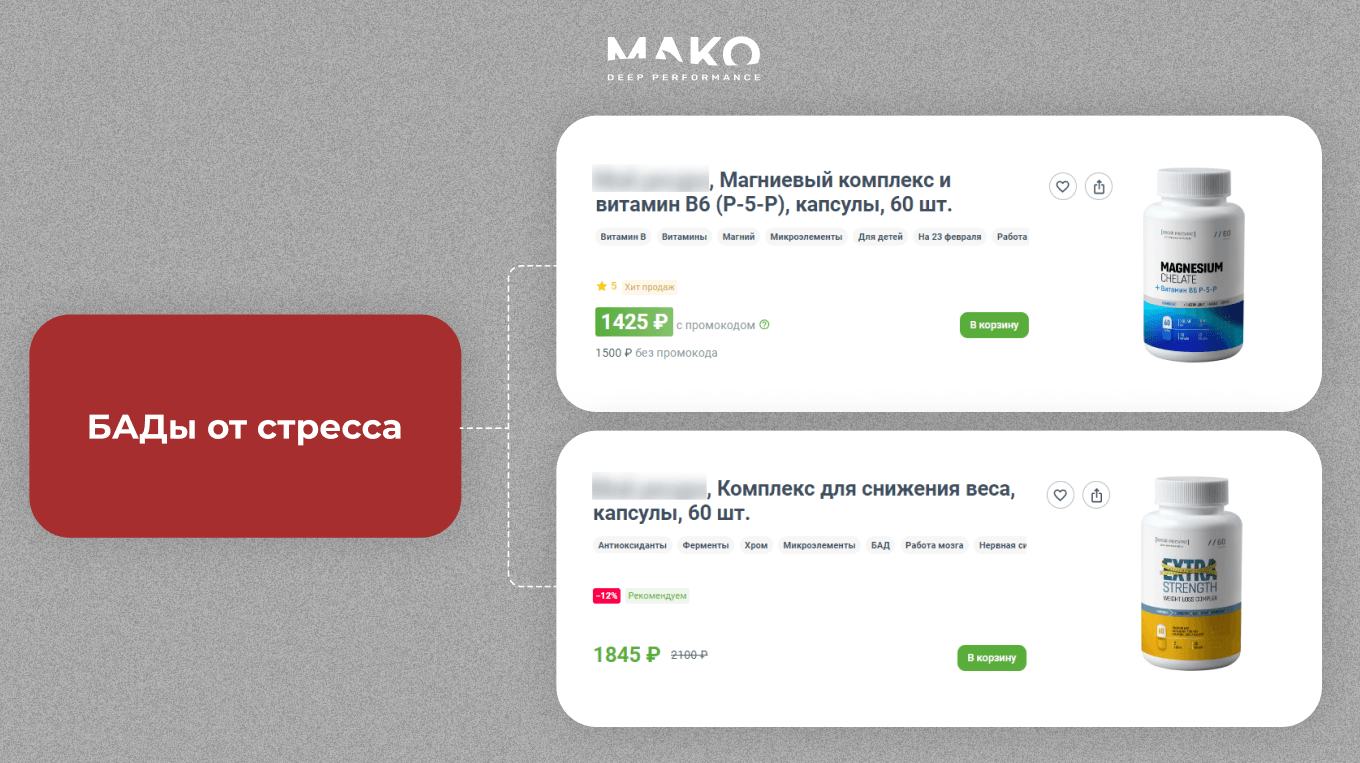 Что происходит? Яндекс при подборе релевантности учитывает только категорию товара, и под один и тот же запрос может загрести товары из материнской и дочерней веток. Например, материнская категория «БАД от стресса», дочерние — «магниевый комплекс», «растительный мелатонин» и еще к ним подтягивается «комплекс для снижения веса», потому что в его составе есть ингредиенты, влияющие на нервную систему тоже.
