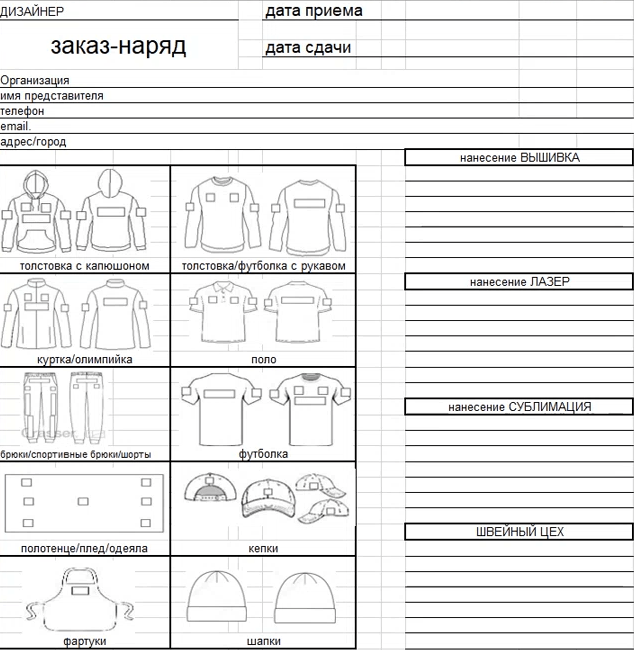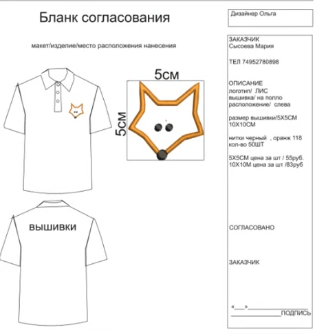 Дизайнеры накладывают эскиз клиента на картинку одежды. Полученный бланк согласования отправляют в отдел продаж, чтобы те переслали его клиенту на утверждение.
