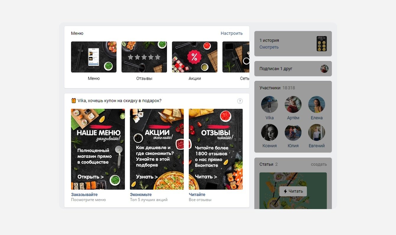 В Сити Ролл мы использовали практически все возможные инструменты ВКонтакте для развития бизнеса: товары и корзину, приложения и виджеты, чат-бота и конкурсы, адреса и время работы.