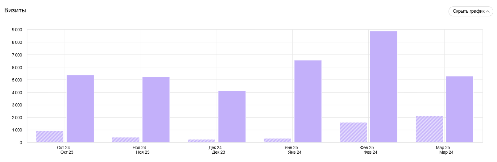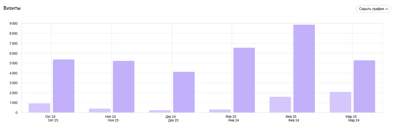 Благодаря технической оптимизации сайта и работе с метатегами получили рост органического трафика на 568% в феврале 2025 года по сравнению с февралем 2024 года (рост с 1498 визитов до 8 513 визитов).