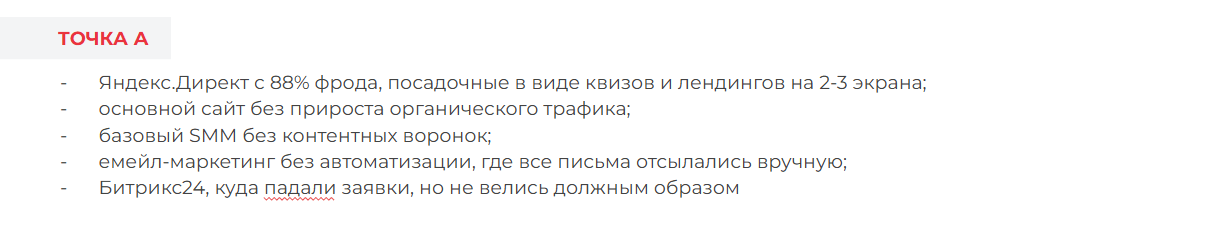 Дополнительно проверили интеграцию с CRM и выдвинули предложение доработать её с точки зрения бизнес-процессов: корректная интеграция позволяет как усиливать Директ с РК с оптимизацией за конверсии, так и собирать аналитику для замера эффективности маркетинга в целом.