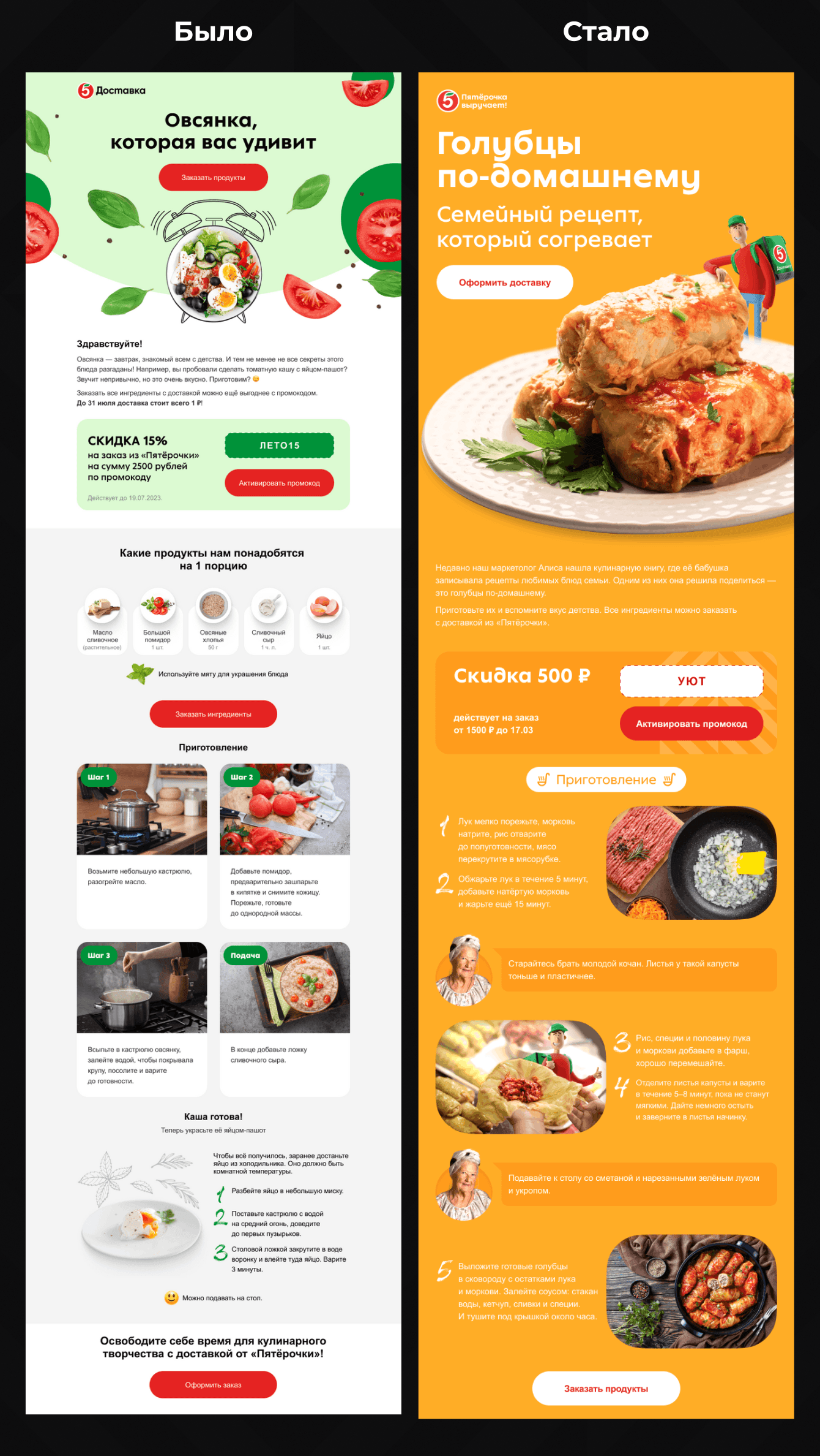Мы непрерывно ищем инсайты о контентных предпочтениях аудитории. Например, выяснили, что в емейле клиенты не так активно реагируют на офферы (на фоне других каналов). Поэтому стали делать в письмах акцент на креатив и пользу: рецепты, лайфхаки.