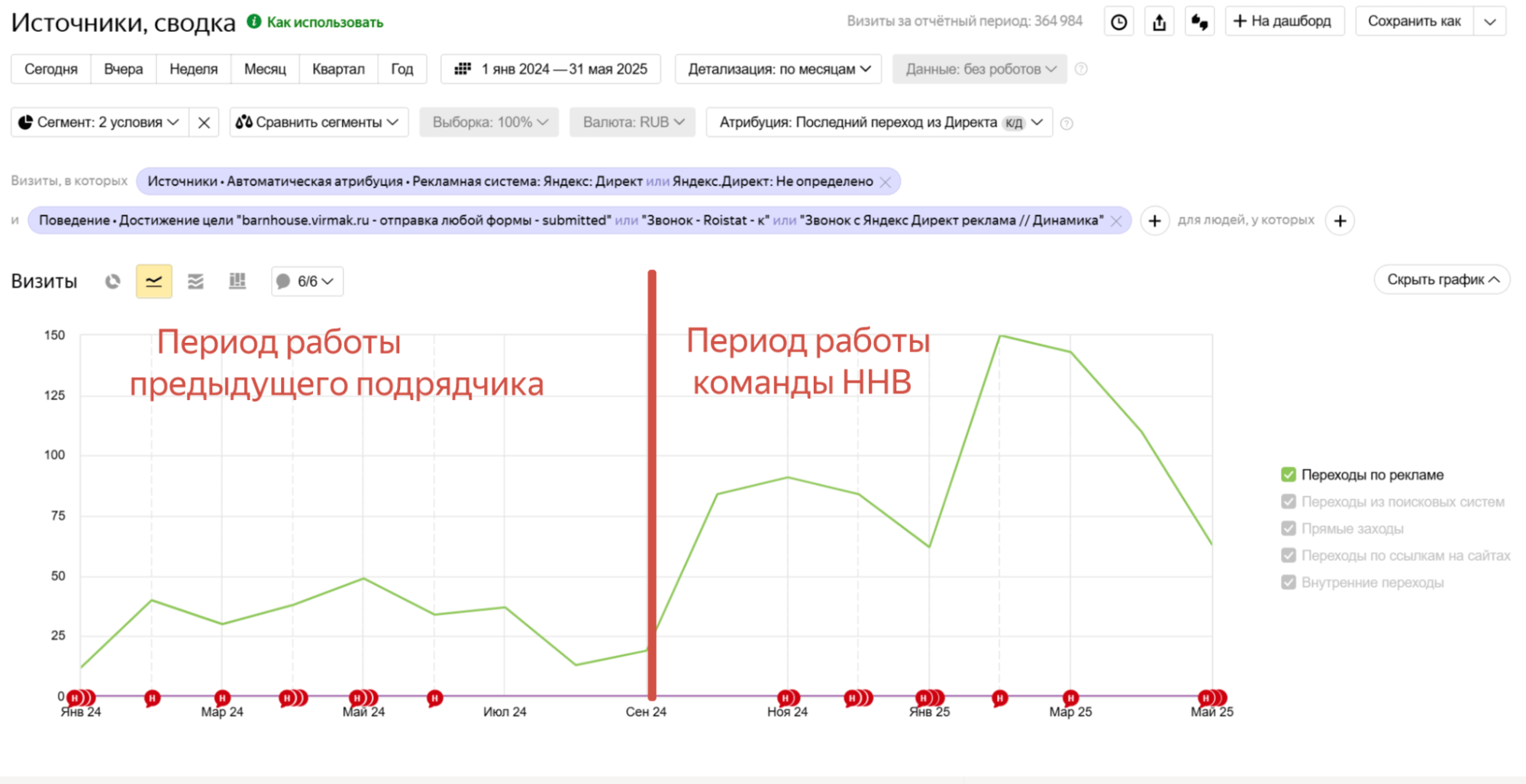 Высокая посещаемость и низкая эффективность - 8 800 - 11 600 переходов на сайт и 13-49 лидов.