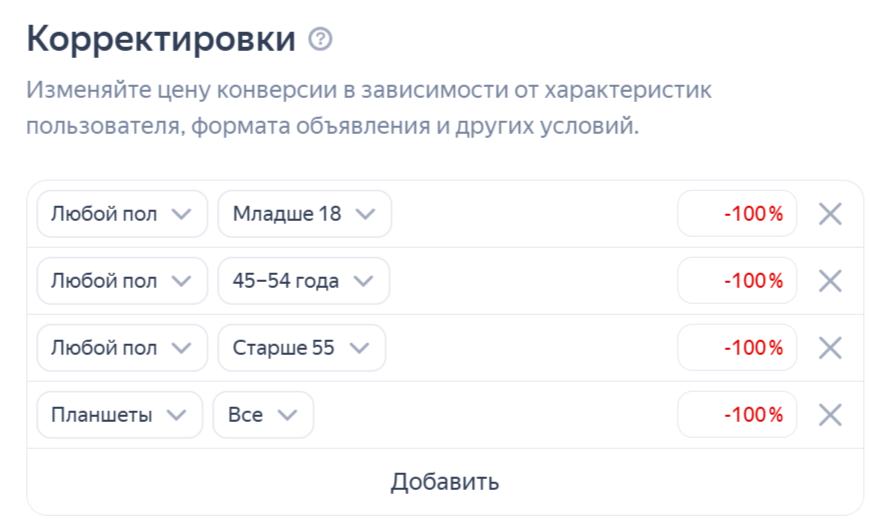 Логика проста: при ограниченном бюджете важно сосредоточиться на самой конвертирующей аудитории. Возрастные группы 45+ показывали заявки, но покупали значительно реже и обходились дороже.