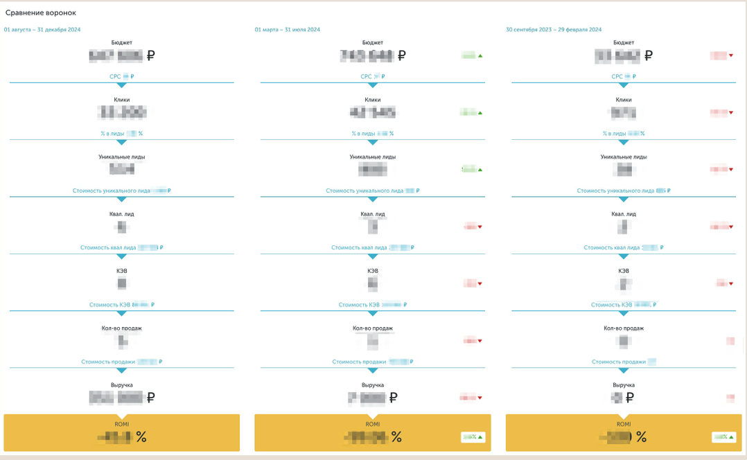 Следующим этапом стал расчет ключевых показателей: сколько заявок требуется для выполнения бизнес-планов, по какой цене их можно привлекать, какую конверсию нужно поддерживать, чтобы реклама не просто окупалась, а приносила прибыль. Такой подход позволил нам выстроить четкую и прозрачную маркетинговую воронку, где каждый этап был подконтролен и измерим.