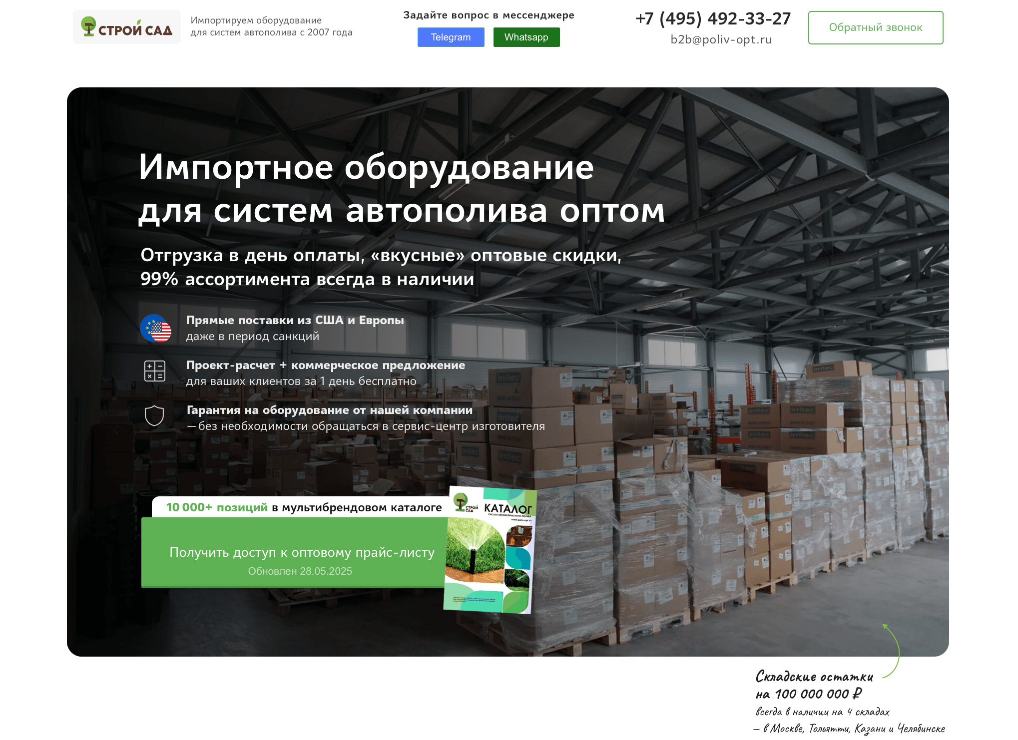 Компания «СтройСад» — один из лидеров на рынке поставок профессионального оборудования для систем полива и водоснабжения, сегодня представлена восемью офисами по всей России. Наше сотрудничество началось еще в 2017 году и за это время превратилось в прочное партнерство, основанное на доверии и общих целях. За восемь лет мы реализовали пять масштабных проектов, а каждый месяц маркетинговые инвестиции стабильно приносят компании прибыль с окупаемостью 246,82%
