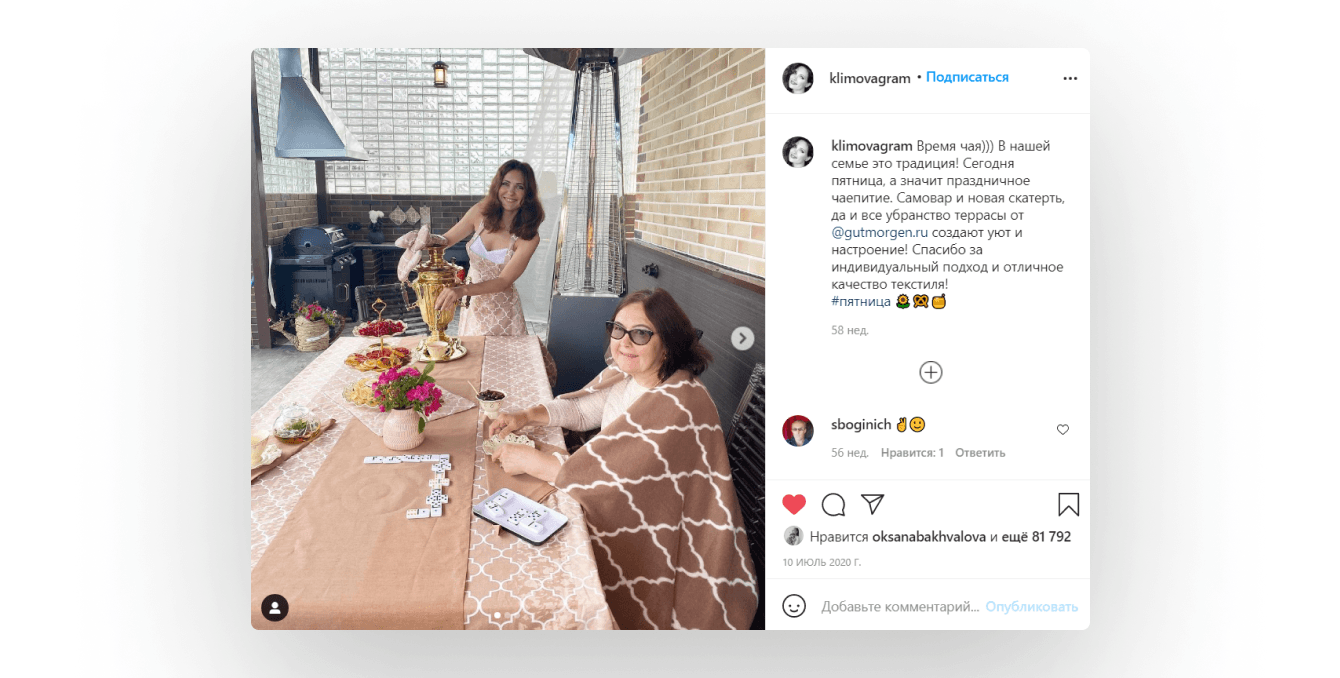 Фактор № 7. Промо с селебрити. Дважды за 1,5 года мы привлекали к сотрудничеству звезд - Ольгу Орлову и Екатерину Климову. Мы отшивали коллекции специально под размеры их мебели и отправляли в подарок. Интеграция с селебрити дает хороший результат для репутации бренда, повышается доверие клиентов. Ее эффект более длительный и часто выходит за рамки соцсети. К примеру, наши фото с Екатериной Климовой вышли на страницах газеты «Телесемь», также мы опубликовали материал про новый дом Климовой и кухню с текстилем от Guten Morgen в нашем канале на Яндекс.Дзен - за месяц он собрал более 13 000 просмотров.