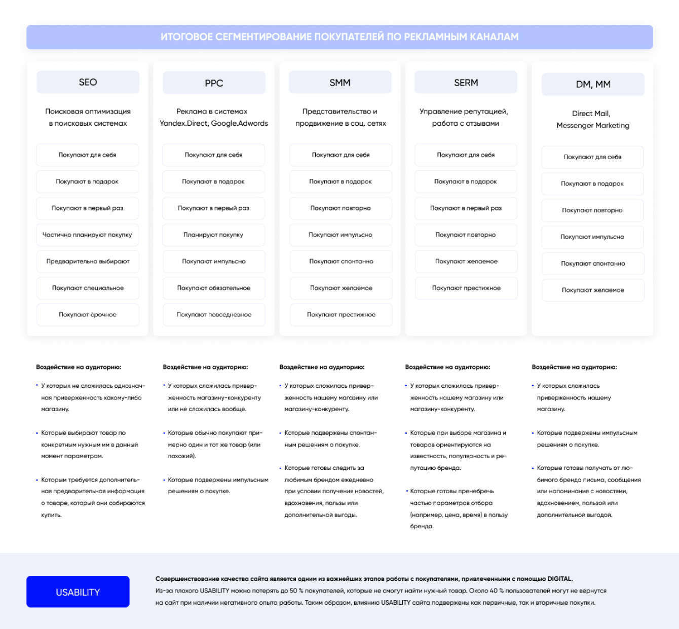 - Подобрать рекламные каналы и инструменты, которые помогут донести информацию о продукте заказчика до пользователей в момент решения им той или иной задачи;