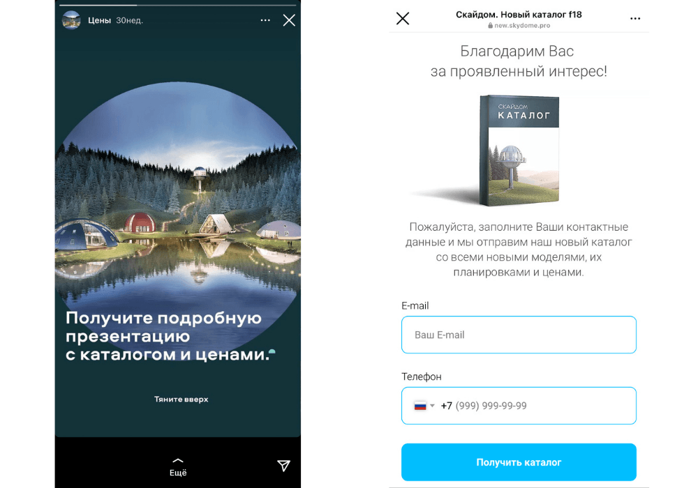 Начали с пути клиента и проработки воронки продаж. В качестве основных посадочных площадок выбрали официальный сайт компании и аккаунт Instagram. С помощью таргетированной рекламы нам предстояло привести целевую аудиторию на сайт, где находилась форма для запроса подробного каталога. После заполнения формы потенциальному клиенту направлялся каталог и через некоторое время поступал звонок от менеджера отдела продаж.