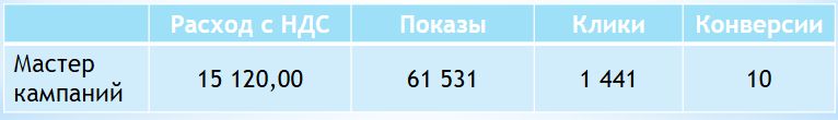 Наш опыт работы с разными клиентами показал, что Мастер кампаний показывает довольно эффективные результаты при небольших бюджетах. Но у него есть такой недостаток, как ограниченная гибкость настроек. Например, нельзя настроить точный таргетинг по аудиториям.
