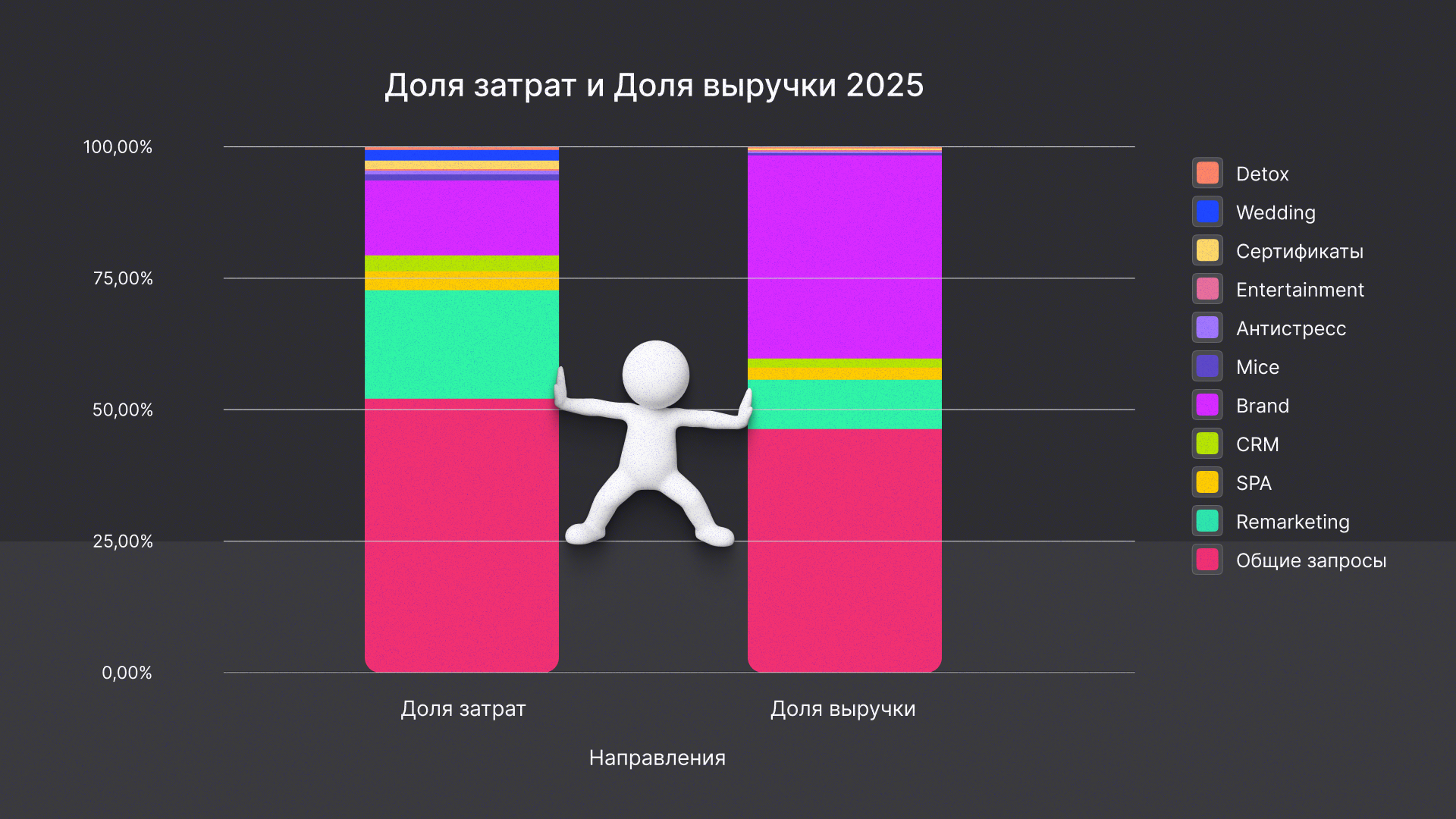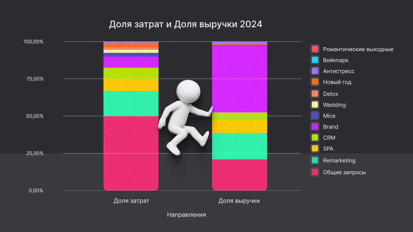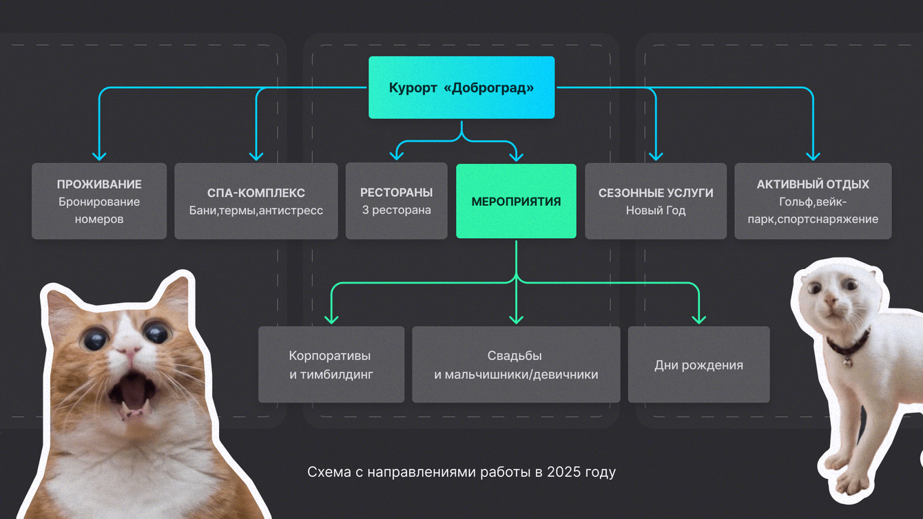 На фоне роста конкуренции во внутреннем туризме в 2024–2025 годах развиваться пришлось без резкого увеличения затрат — за счет настроек, аналитики и оптимизации. Бюджет вырос всего на 30% — это как раз сопоставимо с медиаинфляцией. При этом «Доброград» — это не только проживание, но и SPA, рестораны, спорт, аренда залов и вейк-парк — и каждое направление требует продвижения.