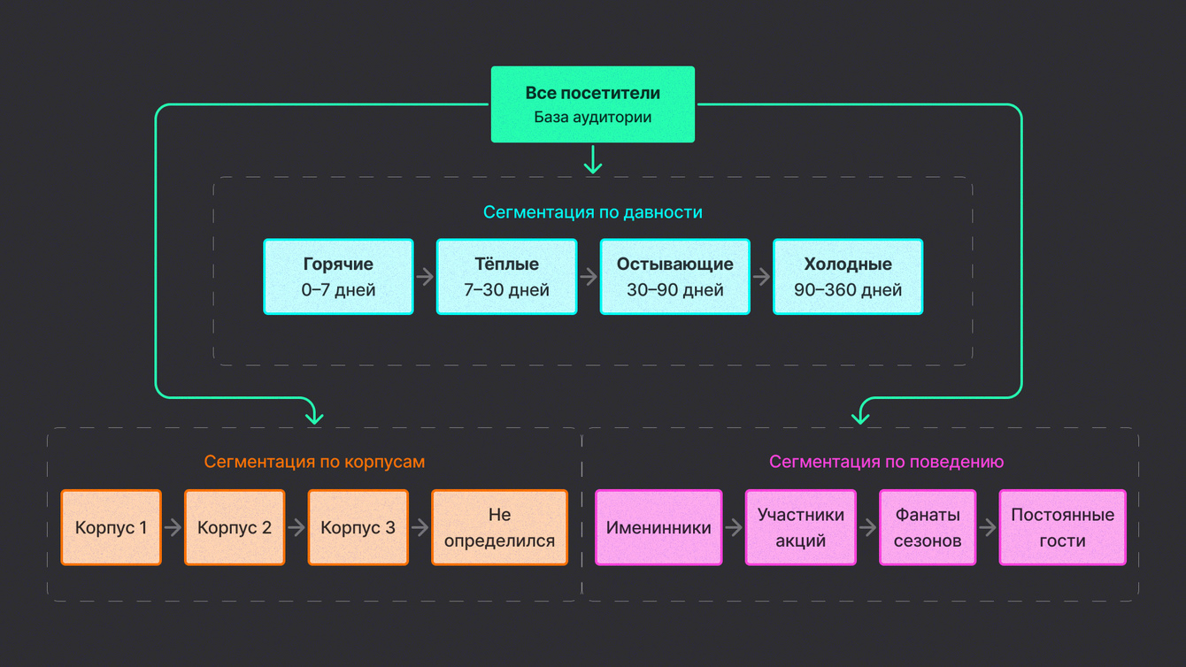Подпись: Сегментация аудитории для ремаркетинга: По давности, По корпусам, По поведению. Это дает возможность показывать максимально релевантные объявления каждому сегменту.