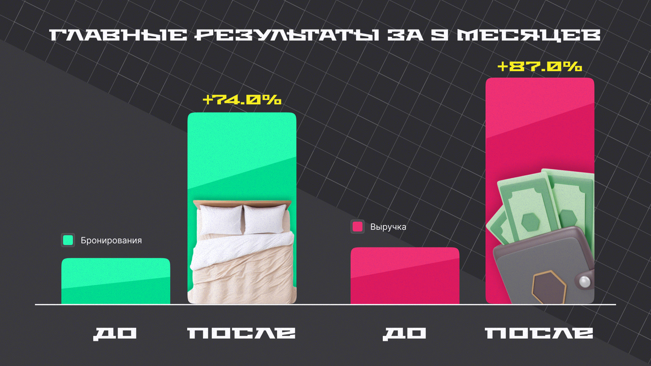 Подпись: Все элементы — от структуры аккаунтов и автостратегий до ремаркетинга и акций — были выстроены так, чтобы усиливать друг друга и давать стабильный рост. В итоге: бронирований стало больше на 74% за 9 месяцев. Выручка выросла на 87% к тому же периоду прошлого года.