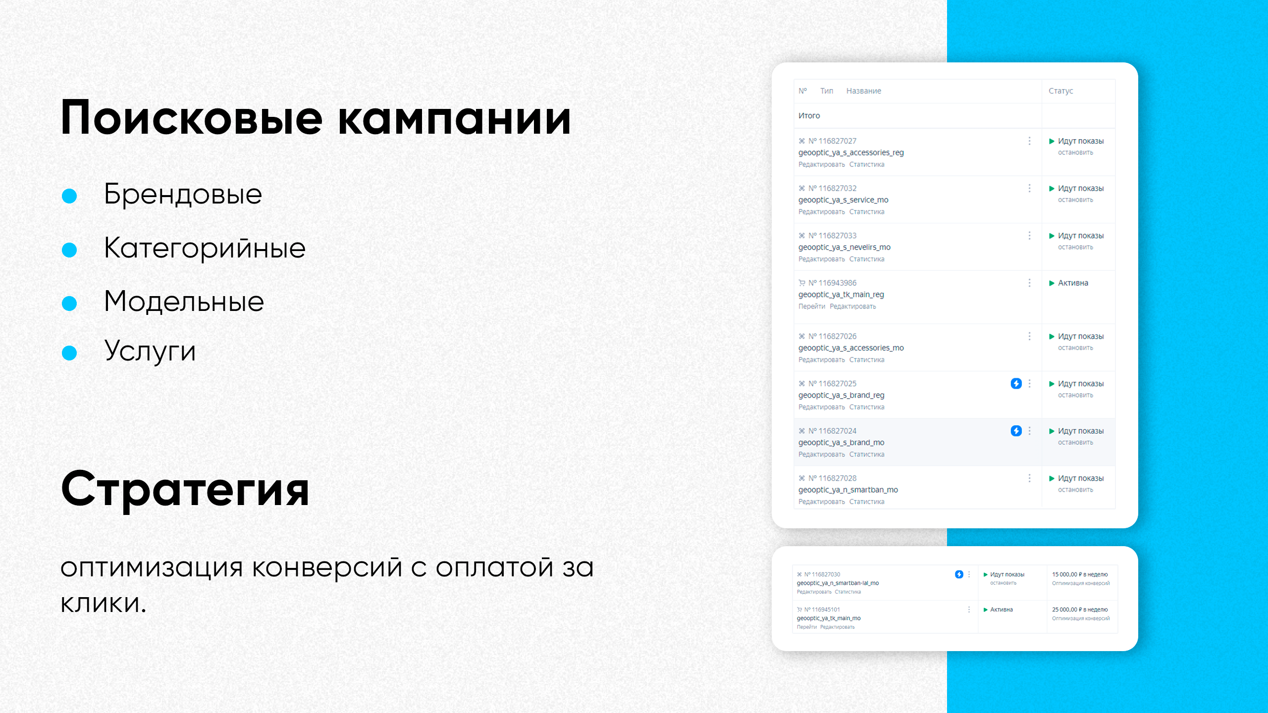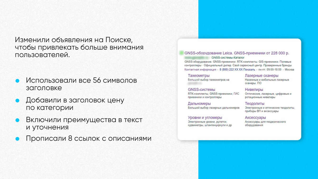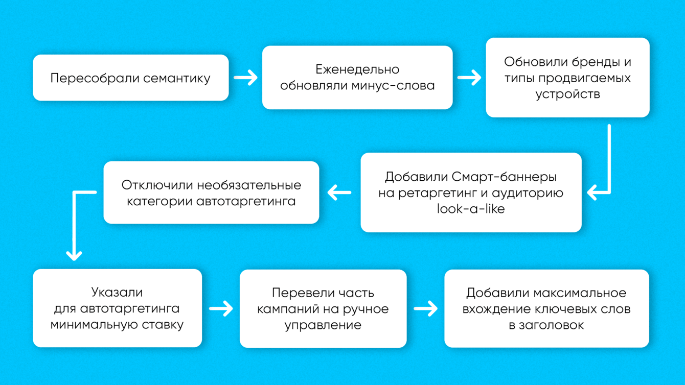 Для продаж самых маржинальных и конкурентных товаров использовалась контекстная реклама. Бюджет в месяц составлял 300 тысяч рублей.