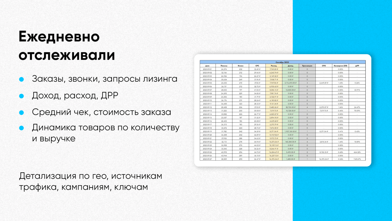 Объединили все маркетинговые данные в онлайн-отчете. Отслеживали заказы, звонки, доход, расход, ДРР, средний чек, стоимость заказа, динамику товаров: по количеству и выручке.