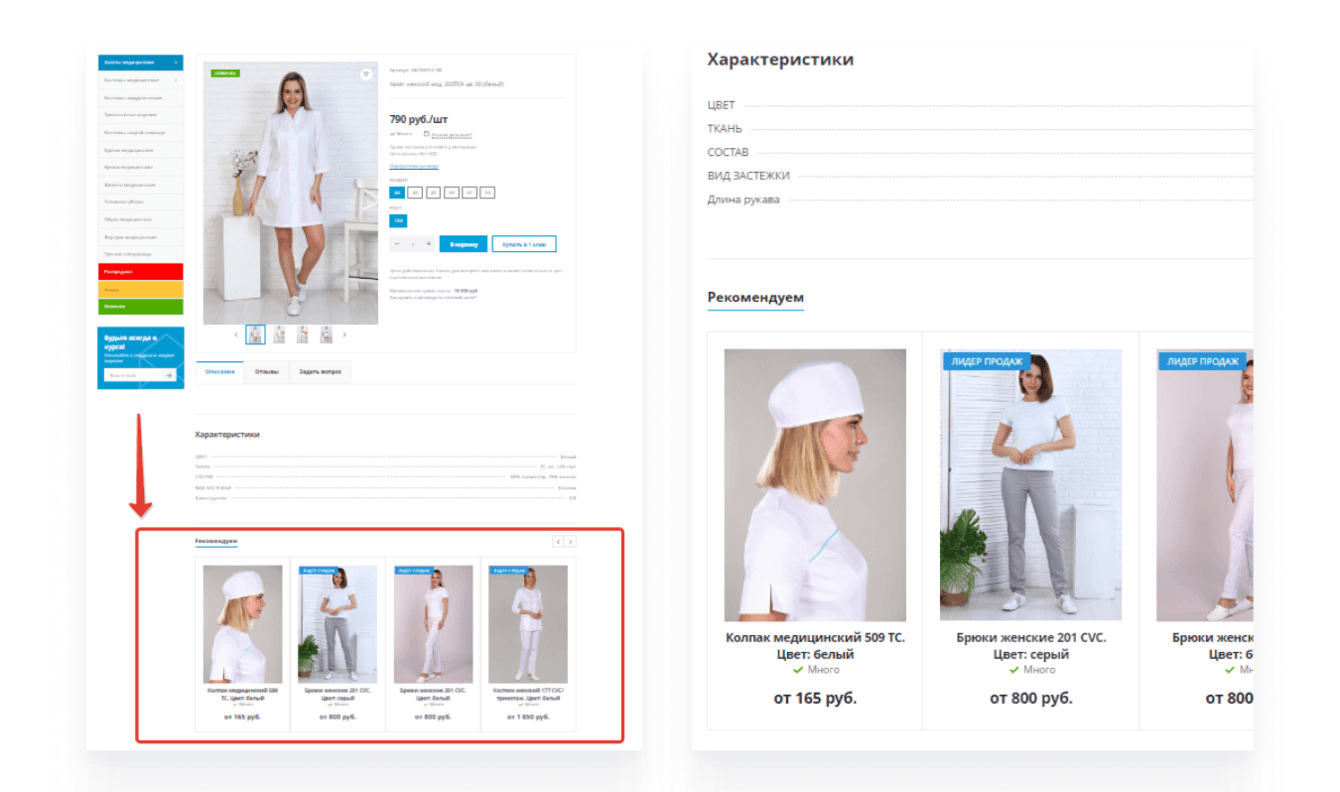 Для повышения среднего чека, а также поведенческих факторов внутри сайта, реализовали вывод на каждой карточке похожих рекомендуемых товаров: