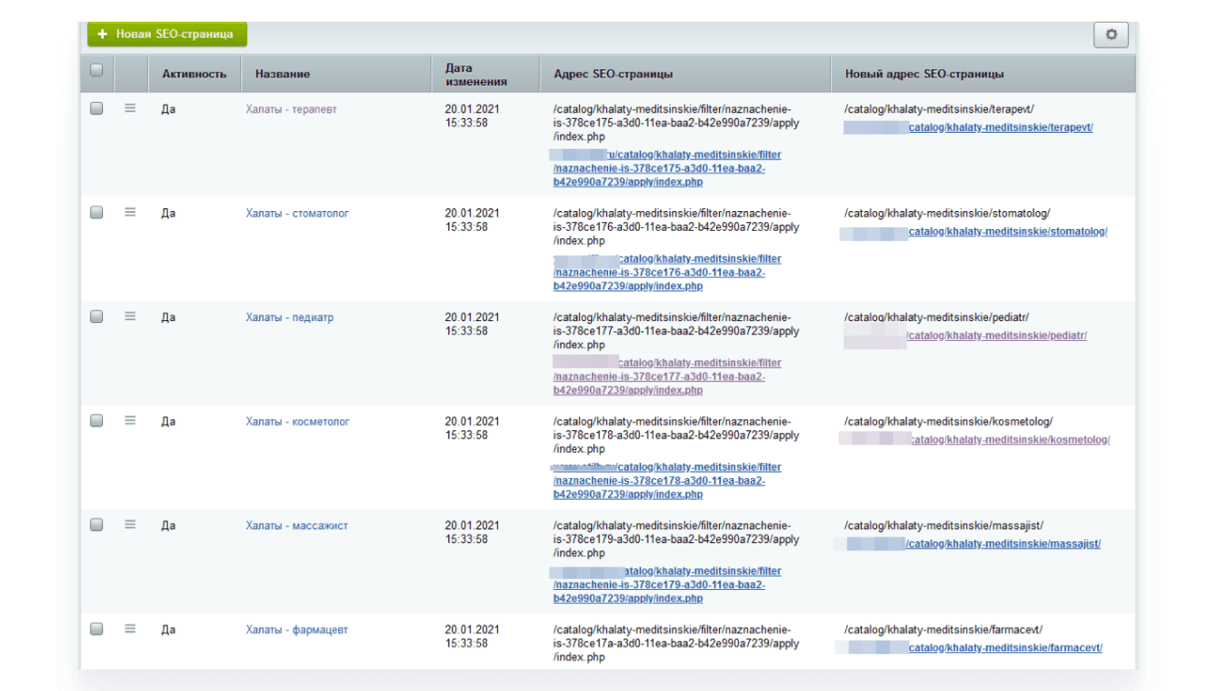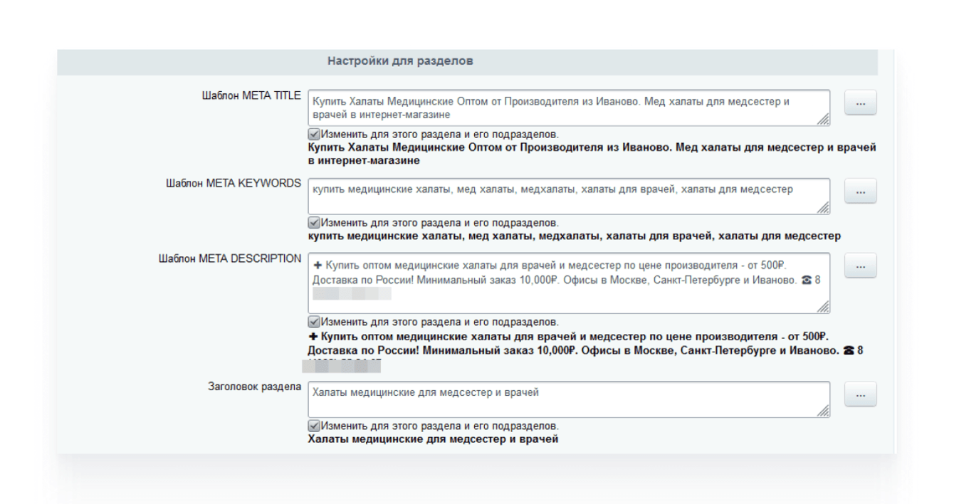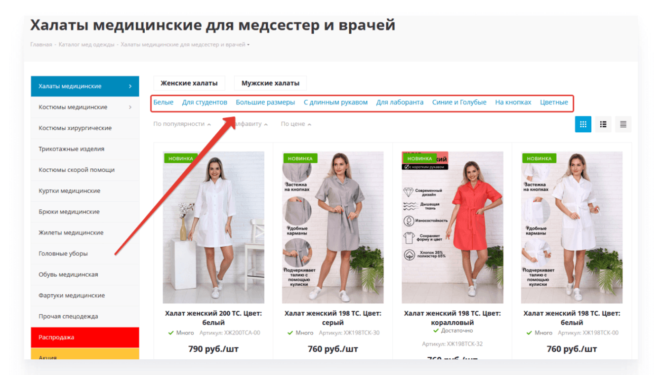 Создали порядка 140+ SEO-страниц под узкие запросы типа «халаты для косметолога», «медицинские халаты на молнии» и прочих с помощью разработанного нами инструмента SEO-шаман (http://marketplace.1c-bitrix.ru/solutions/profistudio.seo/).