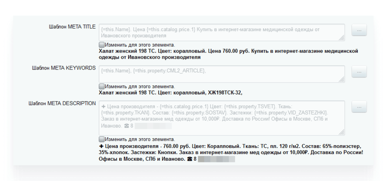 При этом для товаров прописали шаблоны таким образом, чтобы подгружать самую полезную информацию непосредственно из свойств: