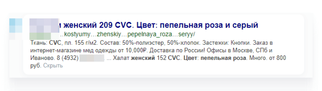 − подгрузили полезную информацию – минимальная цена, цвет, состав, застежки, что делает сниппет страницы в результатах выдачи привлекательнее.