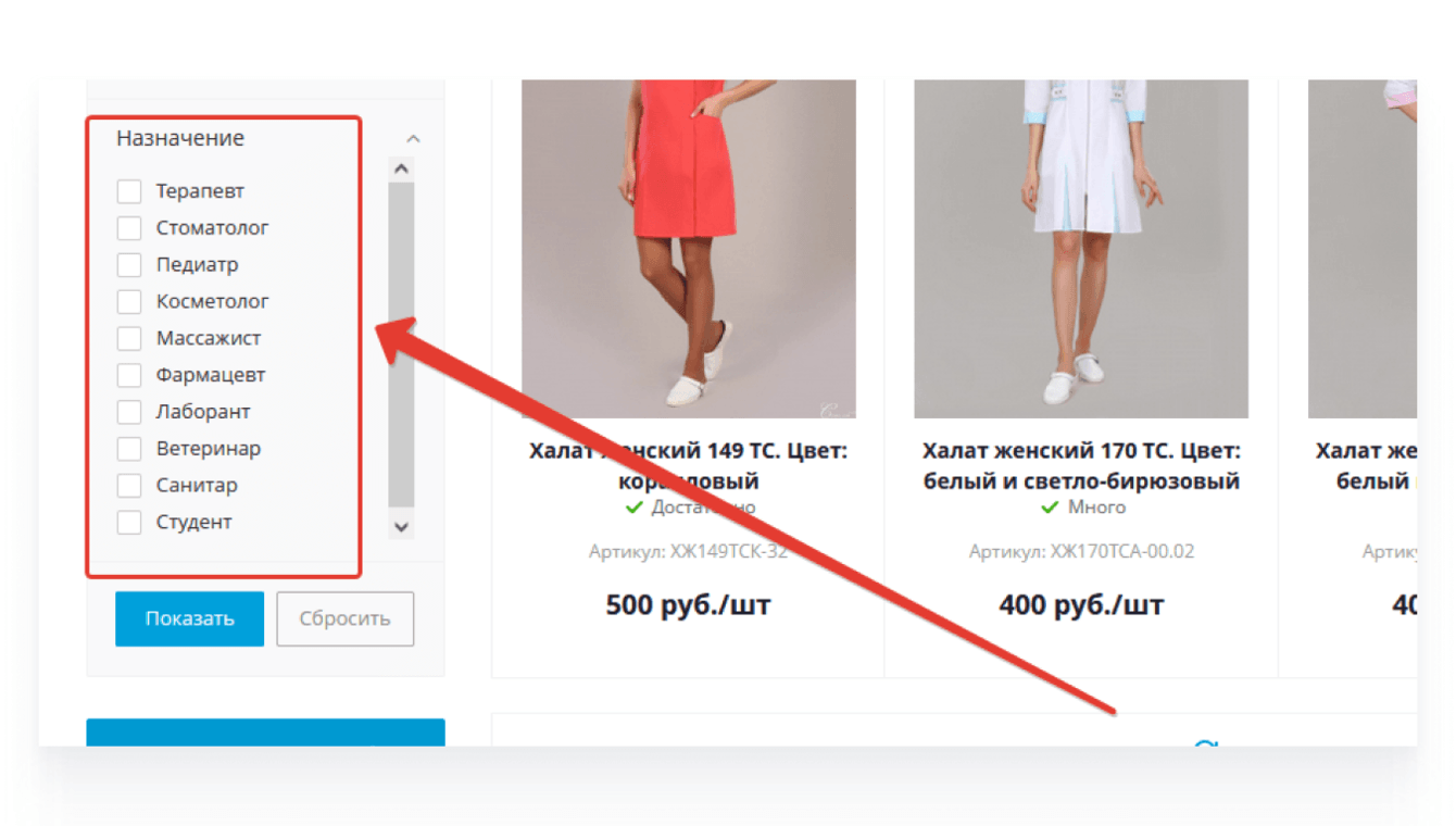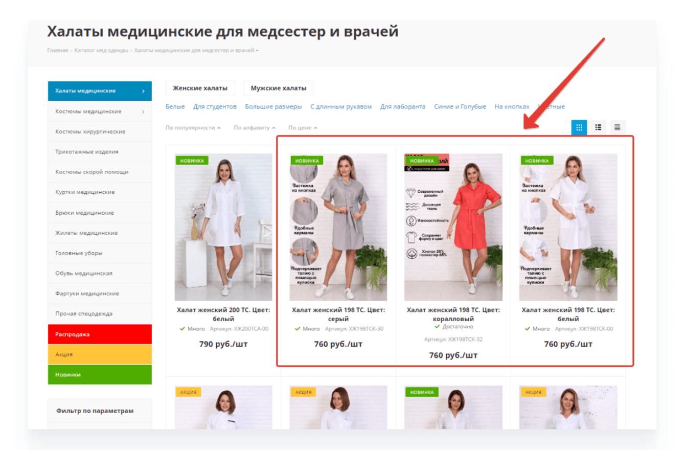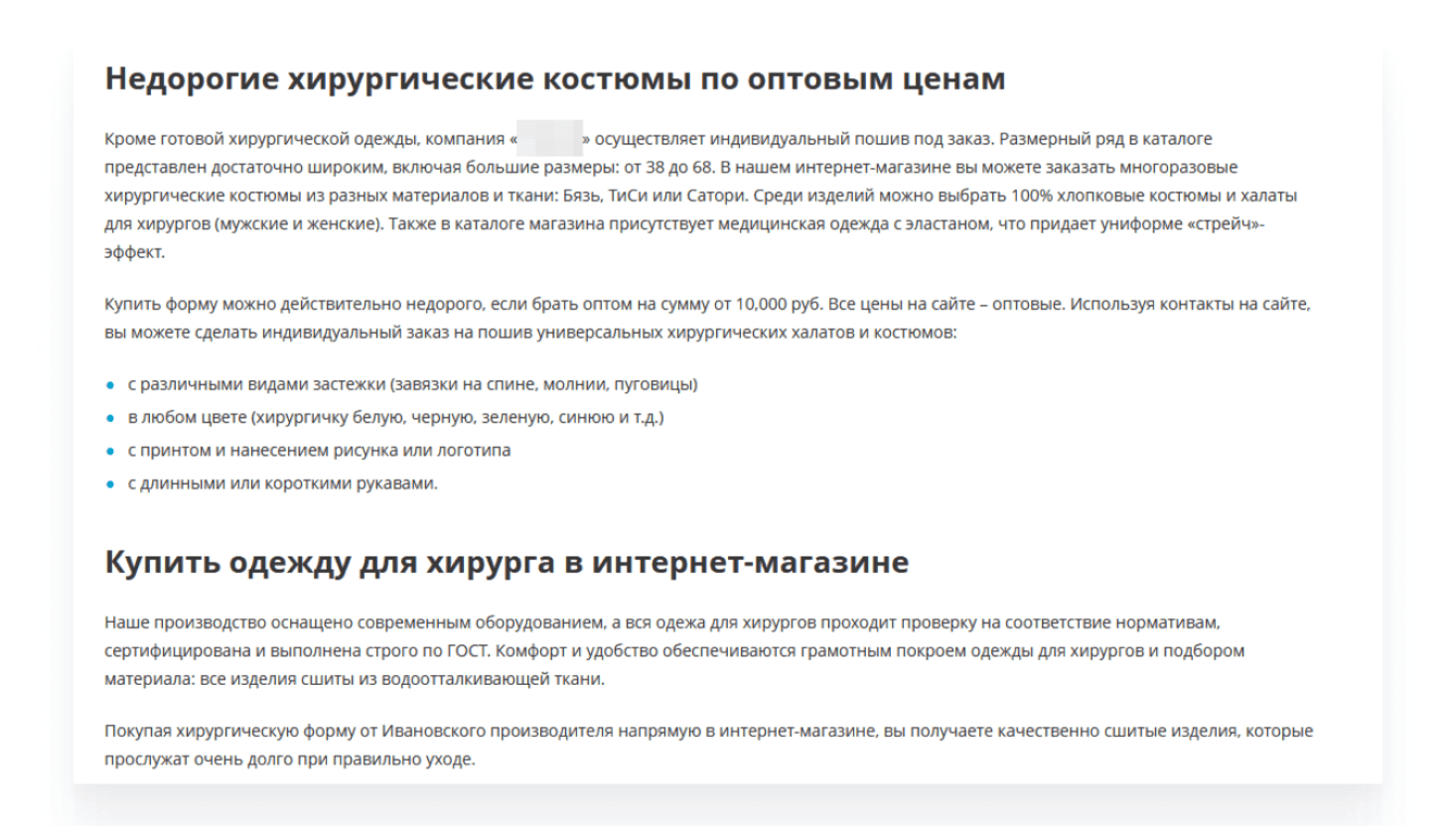 Создали порядка 140+ SEO-страниц под узкие запросы типа «халаты для косметолога», «медицинские халаты на молнии» и прочих с помощью разработанного нами инструмента SEO-шаман (http://marketplace.1c-bitrix.ru/solutions/profistudio.seo/).