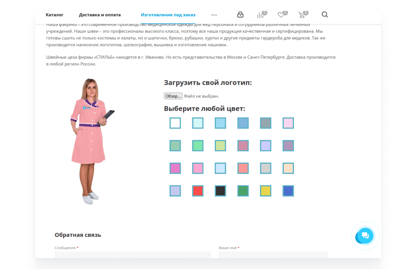 Создали страницу «На заказ» с возможностью выбора цвета одежда и отправки формы заказа. Этот способ взаимодействия важен для тех клиентов (частные клиники, стоматологические кабинеты и пр.), которые хотят сделать индивидуальный заказ, возможно, со своим брендированием.
