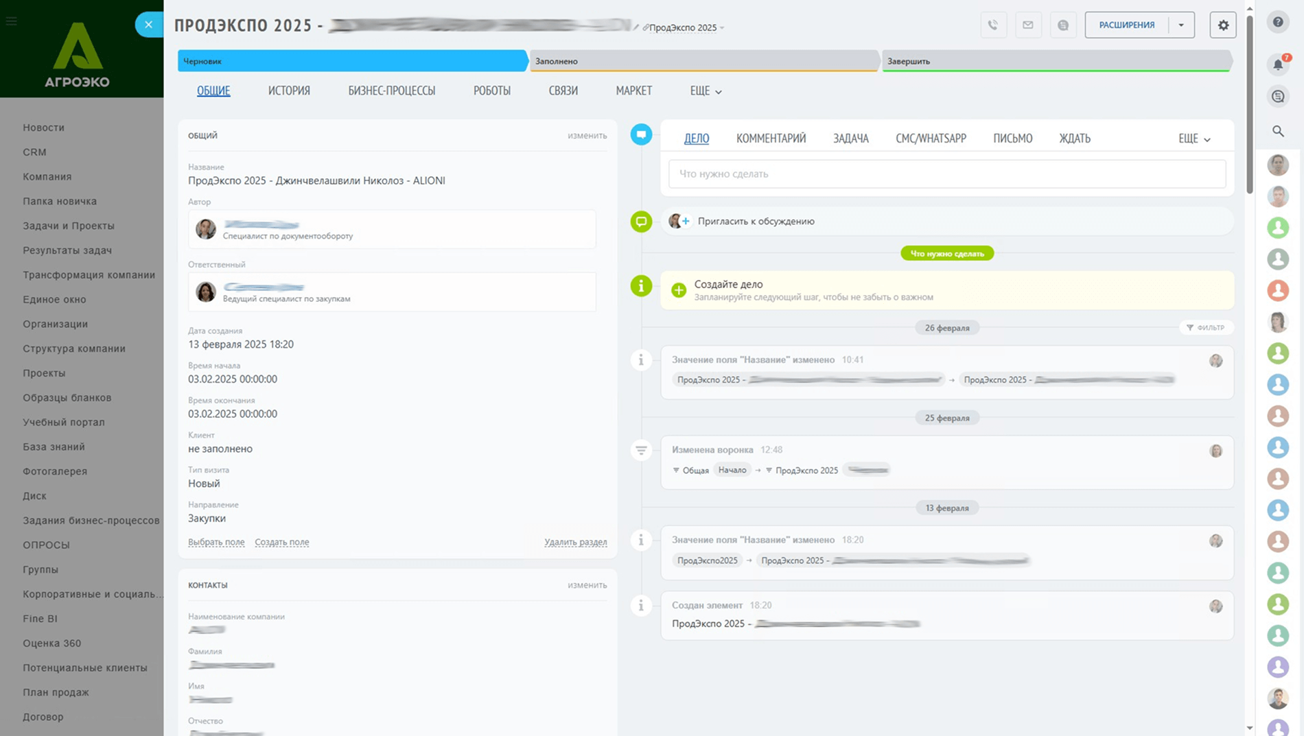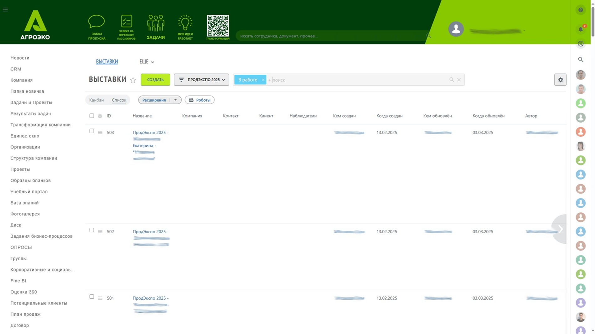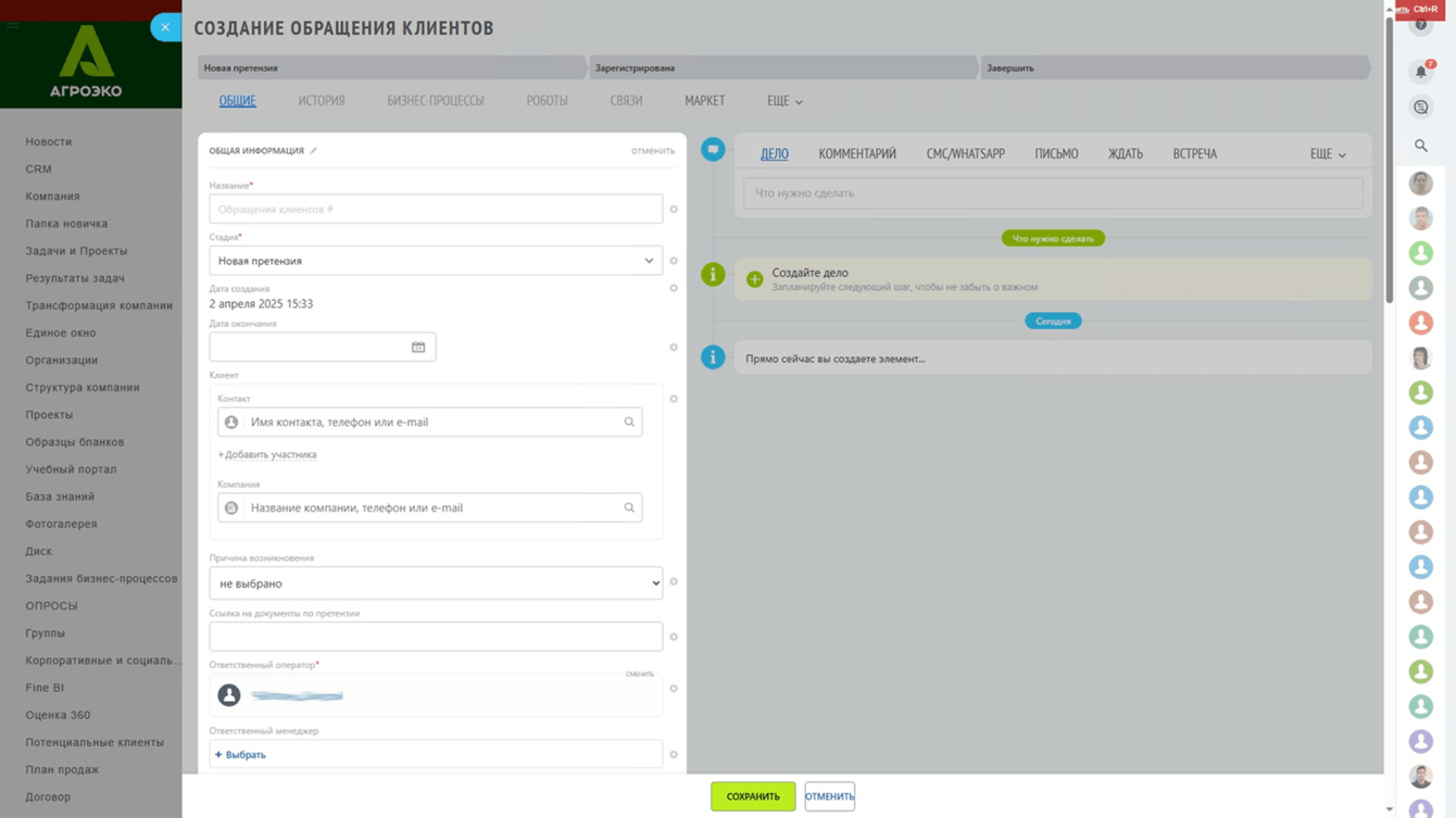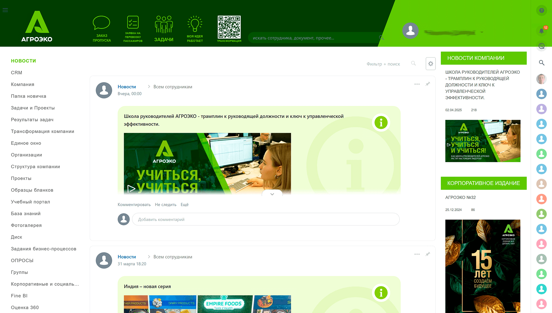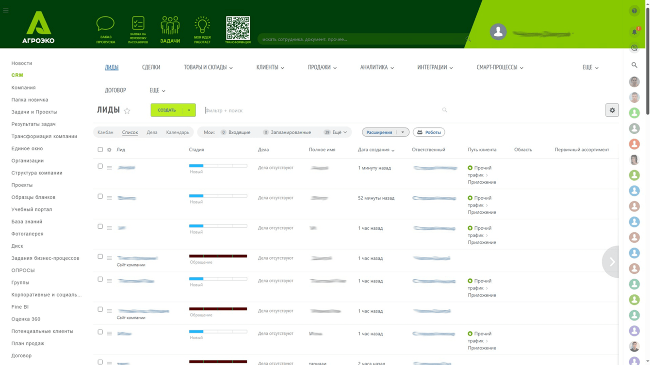 На момент старта проекта Битрикс24 в «Агроэко» уже использовался — но как корпоративный портал. Он служит универсальной площадкой для новостей, базы знаний, коммуникации, постановки поручений и подачи заявок между подразделениями. Сотрудники могли заказать пропуск, оставить заявку в IT-отдел или на вывоз мусора, получить справочник аббревиатур или пройти онбординг через «папку новичка». Платформа была частью ИТ-ландшафта холдинга, но не охватывала ключевые бизнес-процессы.