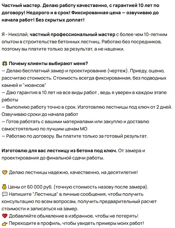 Клиент: Мастер с 10-ти летним стажем. Заливает лестницы и площадки под ключ. По договору, с замерами и гарантиями. Но на Авито заявки не шли.