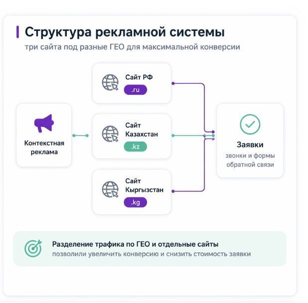 Использовали 3 отдельных сайта под каждое направление (РФ, Казахстан, Кыргызстан). Пользователь попадал на релевантный регион с локальными контактами. Это позволило повысить доверие и конверсию без смешивания трафика между гео.