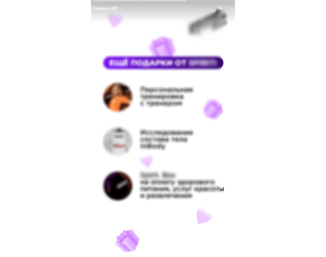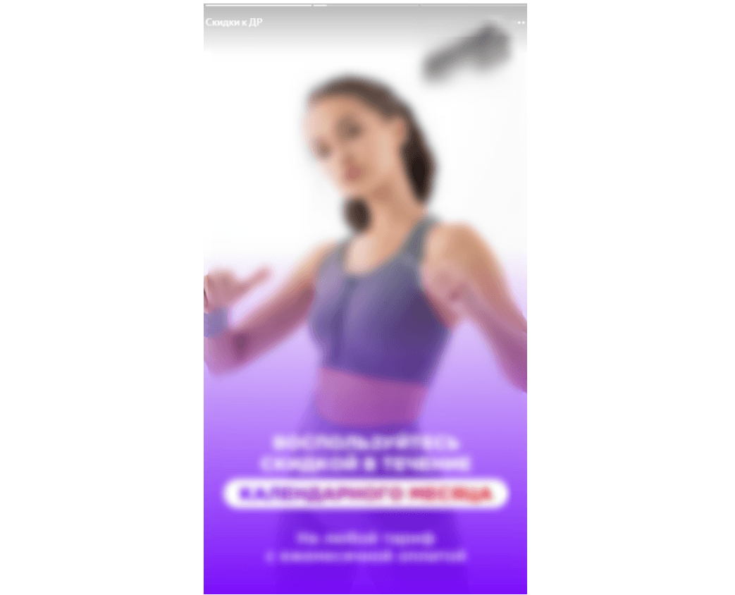 Истории разбили на отдельные блоки для определенных предложений: проведение марафона, скидки ко дню рождения, наличие групповых тренировок и т. д., чтобы упорядочить по направлениям.