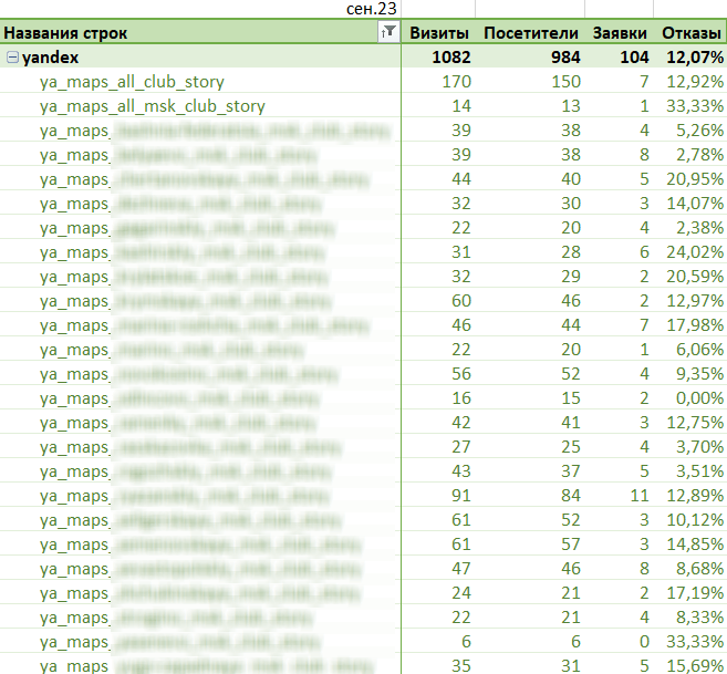 К сожалению, «Яндекс Карты» не собирают и не показывают статистику по историям. Однако разметка ссылок UTM-метками, «Яндекс Метрика» и умение строить сводные таблицы помогают провести полноценный анализ и оценить эффективность этого инструмента. Мы собирали кастомный отчет вручную — только так можно определить результативность.