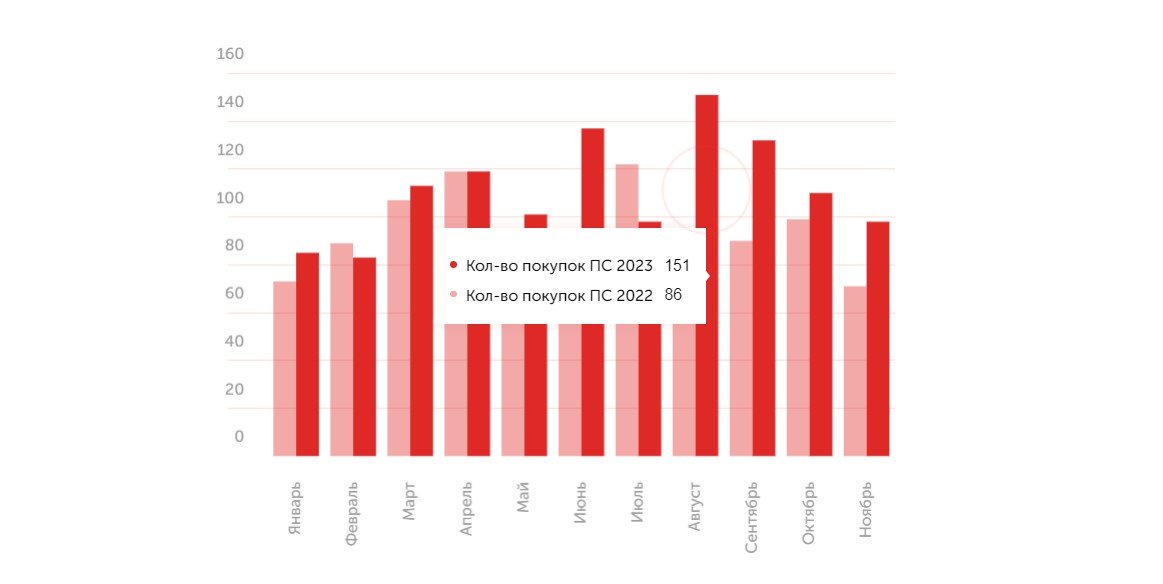 На графике видно, как менялось количество покупок месяц к месяцу. Количество покупок по переходам из поисковых систем выросло в 2023 на 21%.
