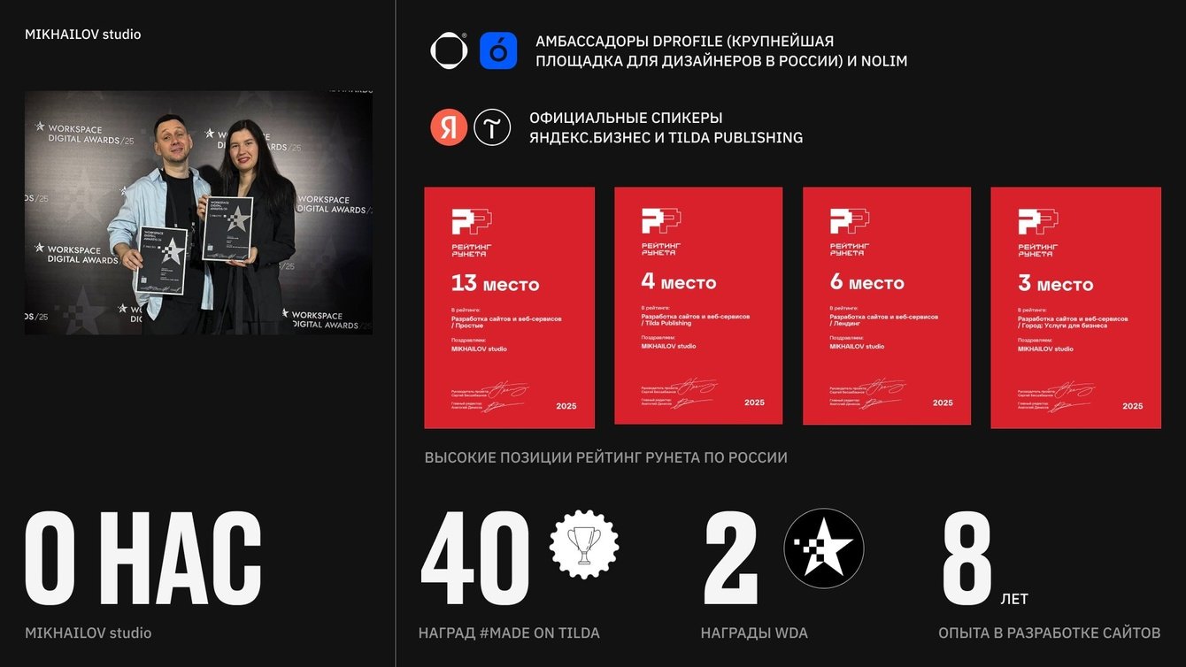 — 2 бронзы в Workspace Digital Award — премии, где выбираются лучшие кейсы за год в сфере digital. В 2025 году выиграли в категориях «лучший сайт для малого бизнеса» и «развлечения, спорт, туризм»;