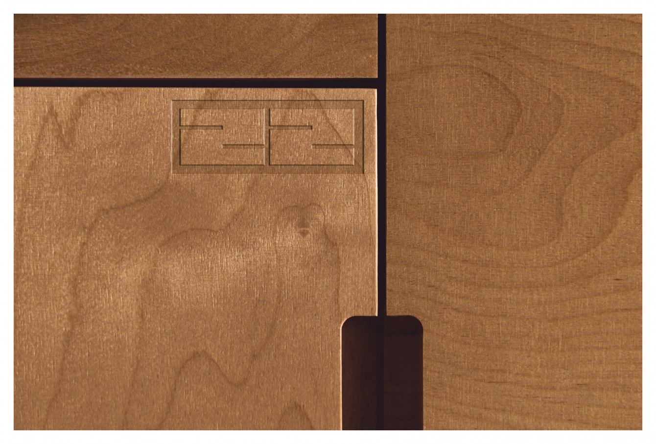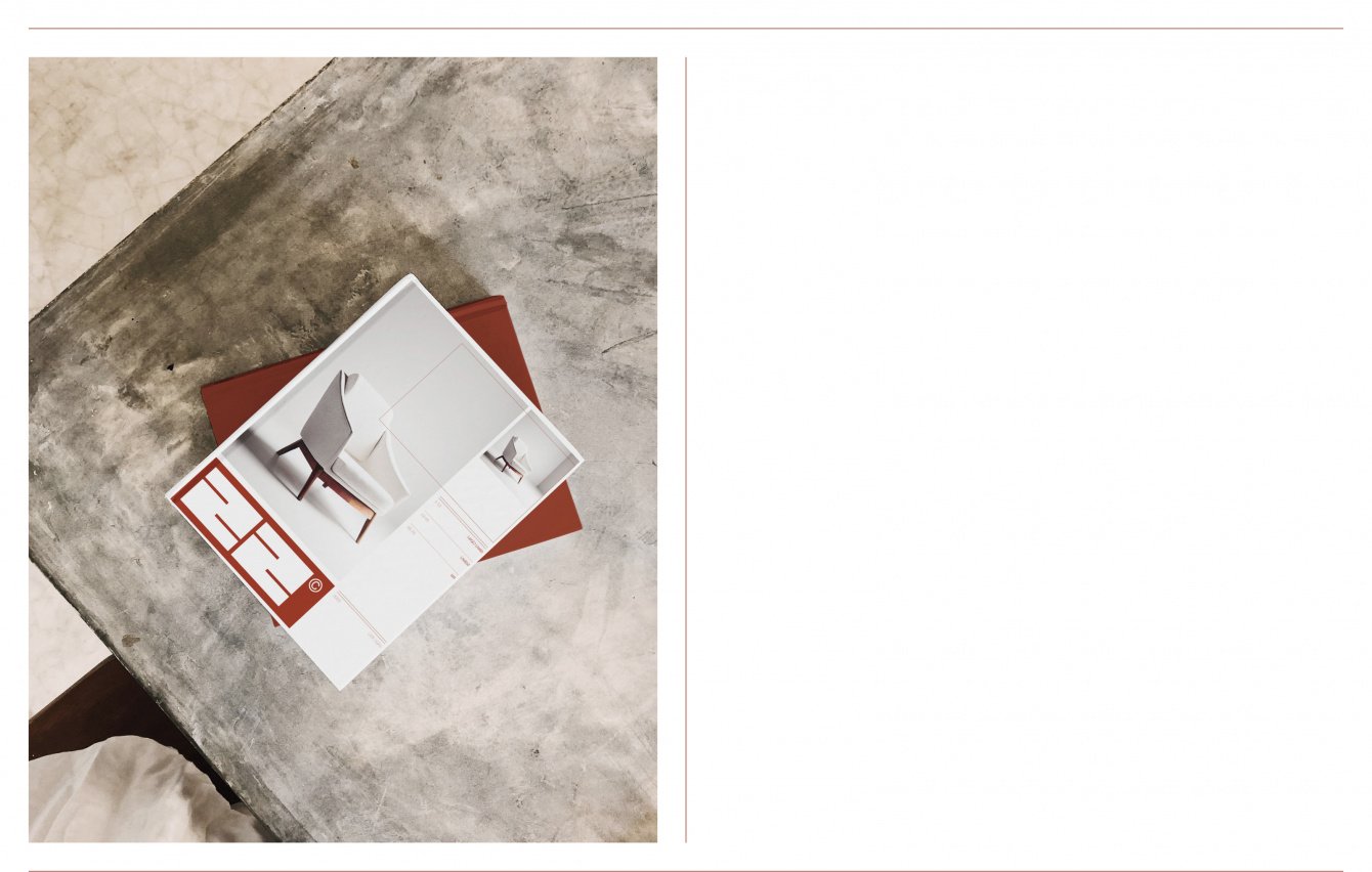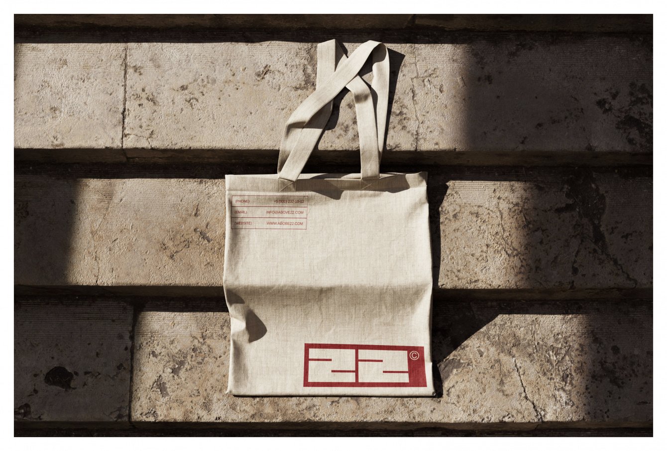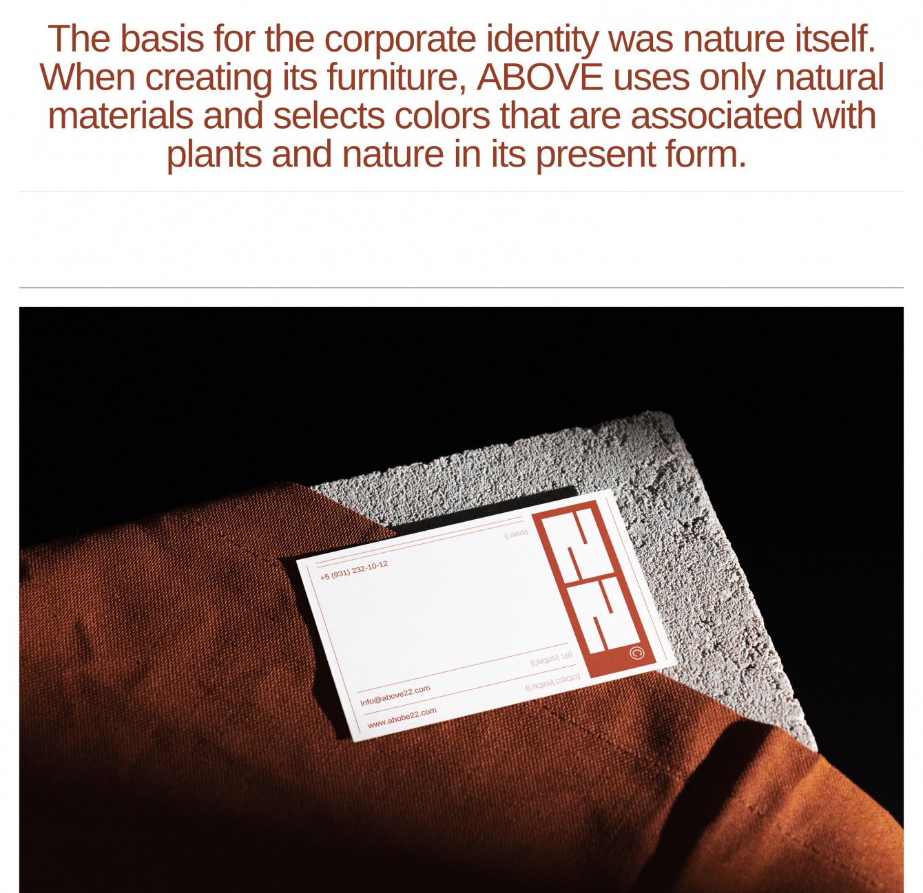 Фирменным знаком бренда стала цифра 22 - ее начертание напоминает рельеф обработанного дерева, а кому-то может показать похожей на стул или кресло. Для логотипа предусмотрено несколько вариантов использования - в монохроме, цвете, с рамкой или без нее. Для слова ABOVE в названии был подобран шрифт, также напоминающий строгие формы мебели.