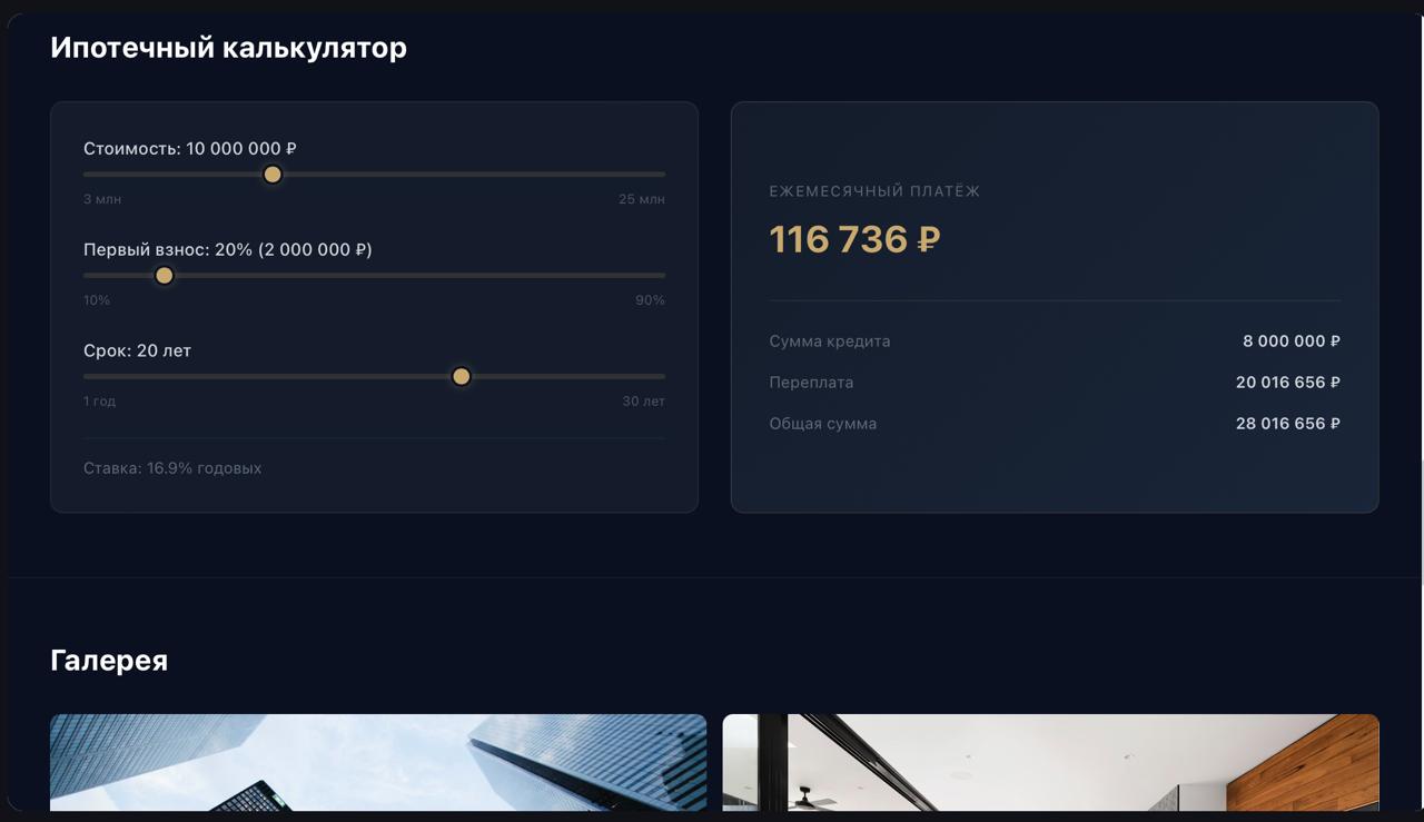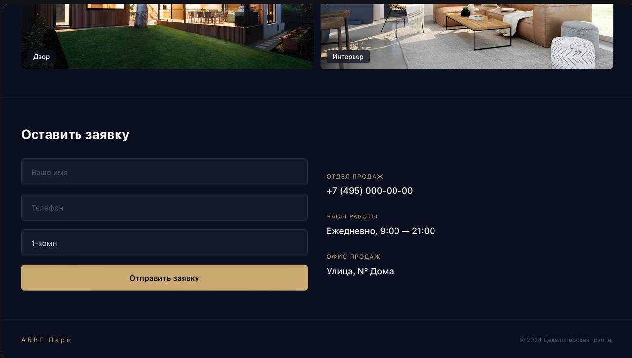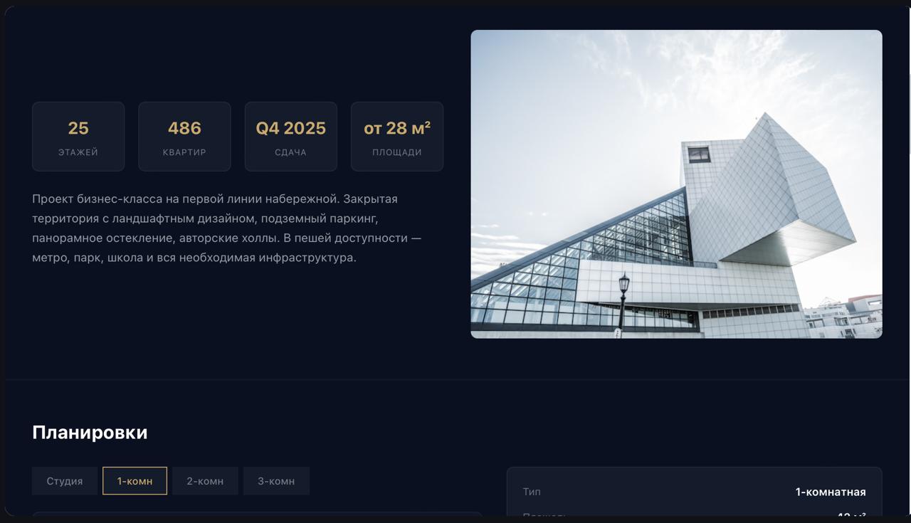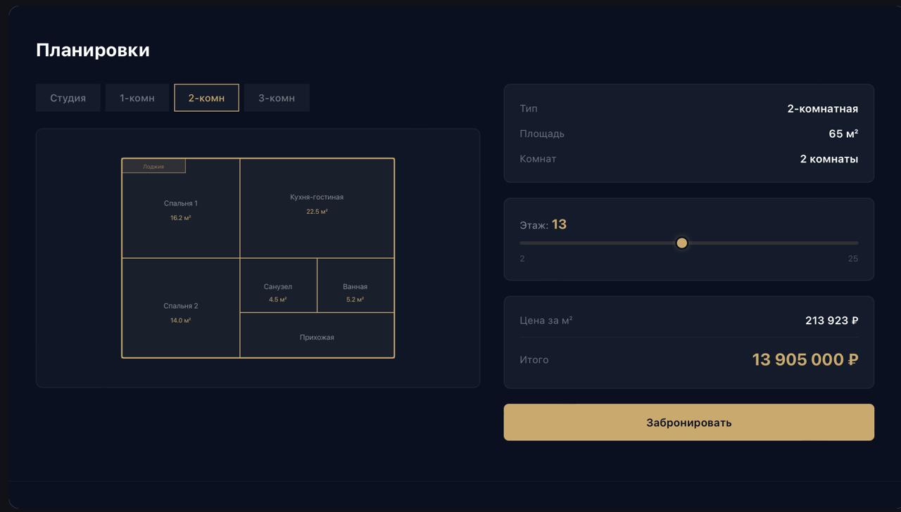 Задача: разработать промо-сайт ЖК бизнес-класса с планировками квартир, переключением этажей, калькулятором стоимости и формой заявки.