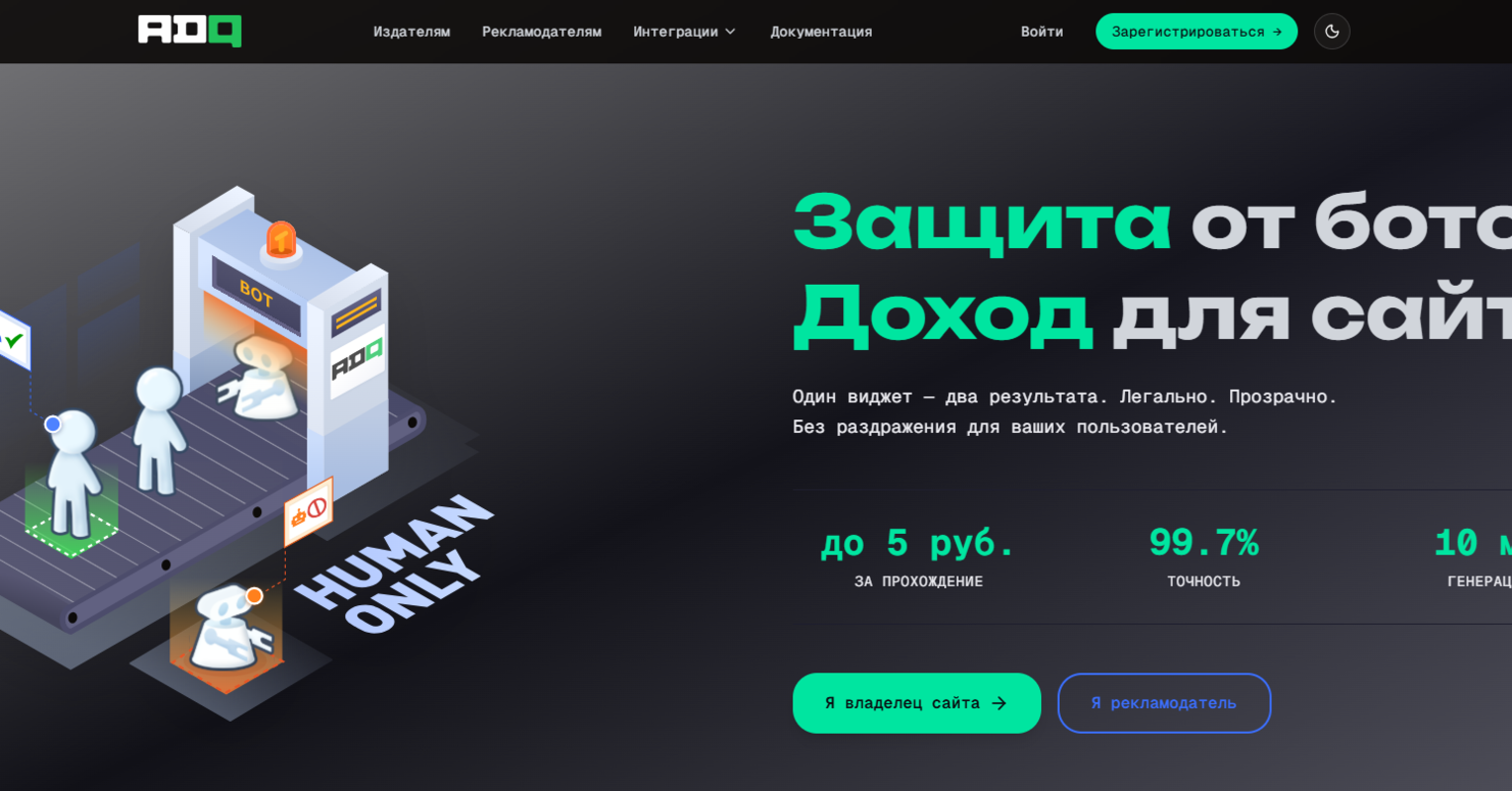 Владельцы сайтов интегрируют виджет за 5 минут без привлечения разработчика и начинают получать доход с каждой верификации. Рекламодатели получают инструмент с гарантированным просмотром, пользователь физически не может пройти верификацию, не взаимодействуя с рекламой, что принципиально отличает AdQuest от баннерной рекламы с блокировщиками.