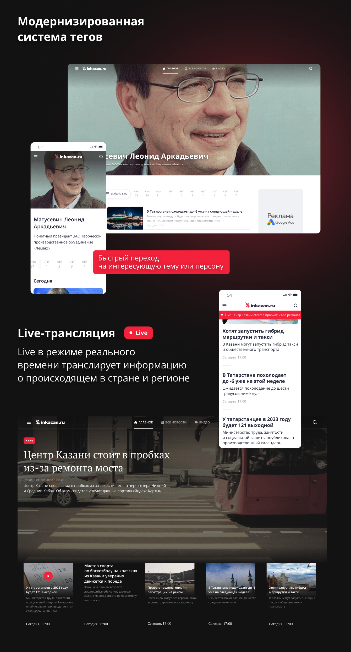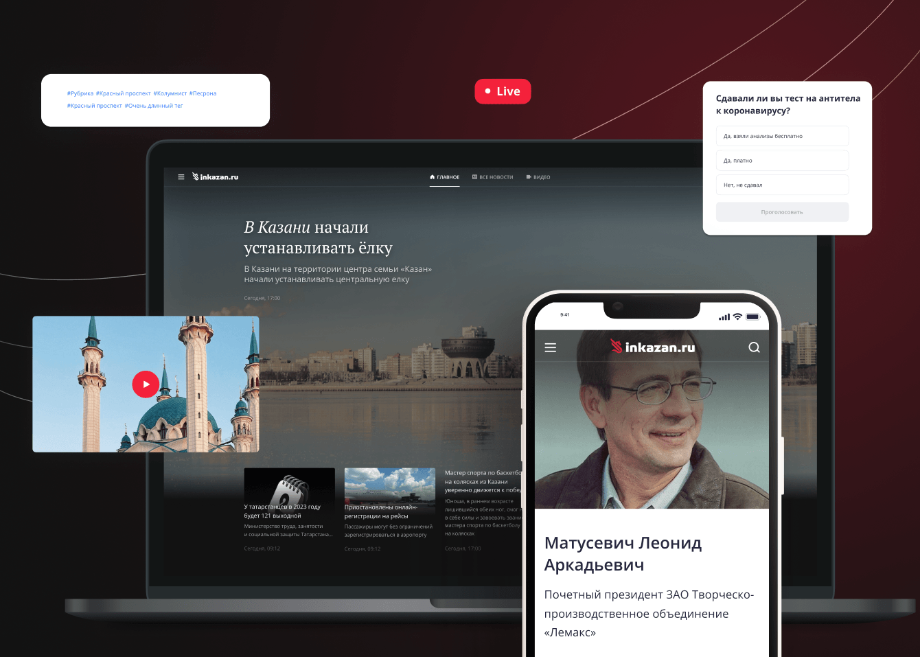 Так мы остановились на «чистом» дизайне и создали шаблон, который подходит для любого издания холдинга. Он отличается от привычных сайтов СМИ — в нем нет отображения новостей в виде плиток.