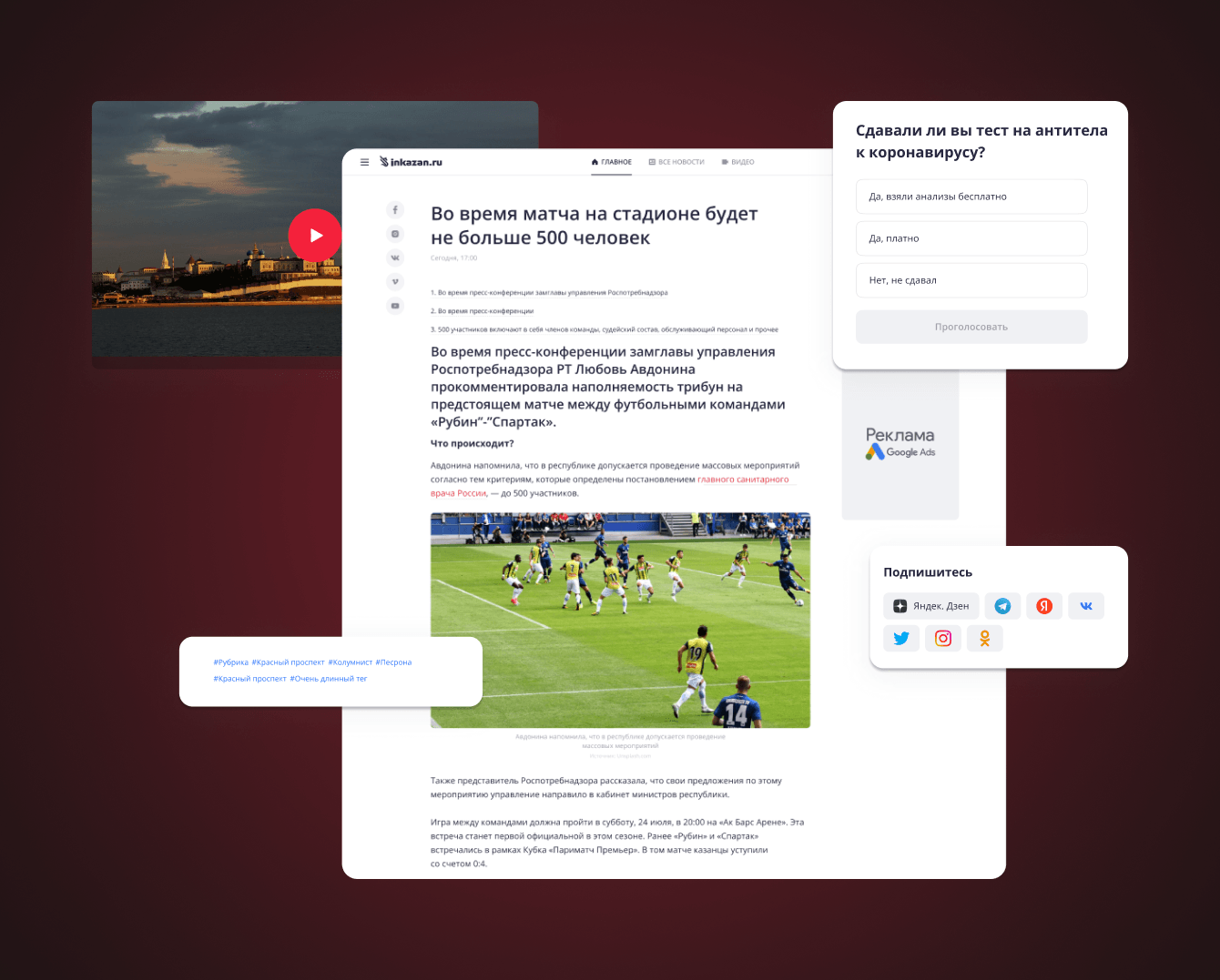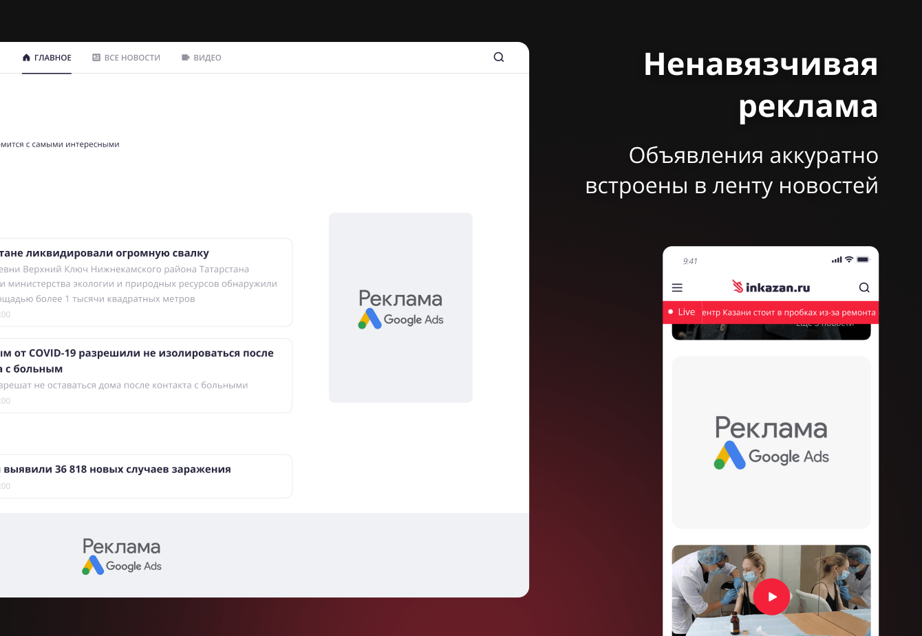 Однако оставили возможность размещать рекламу на сайте — теперь она аккуратно встроена в ленту новостей. Мы вывели рекламный блок в универсальном контейнере, благодаря чему при загрузке страницы текст новости не «скачет» и не затрудняет чтение и скролл.