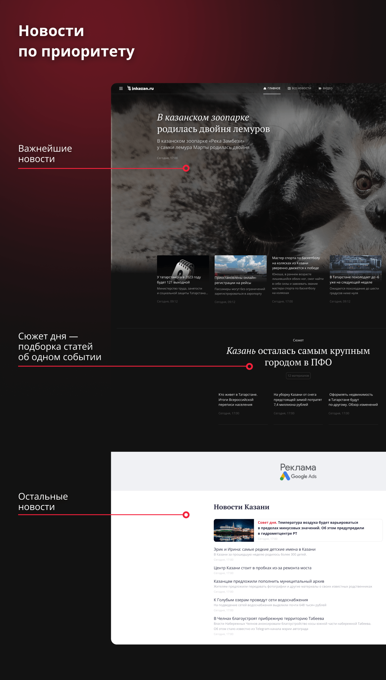 Сначала мы задумались, что ищет читатель на новостном портале? Ответ очевиден — новости, конечно. Поэтому доступ к ним должен быть максимально простым.