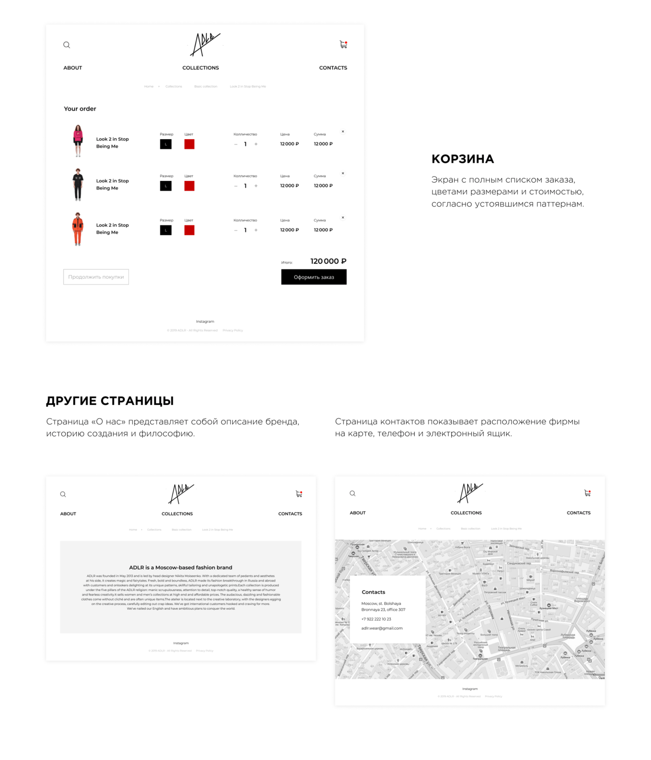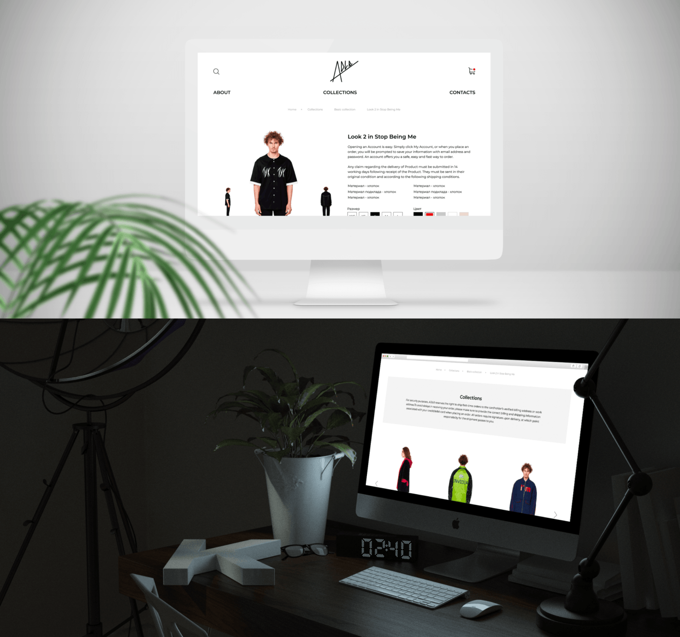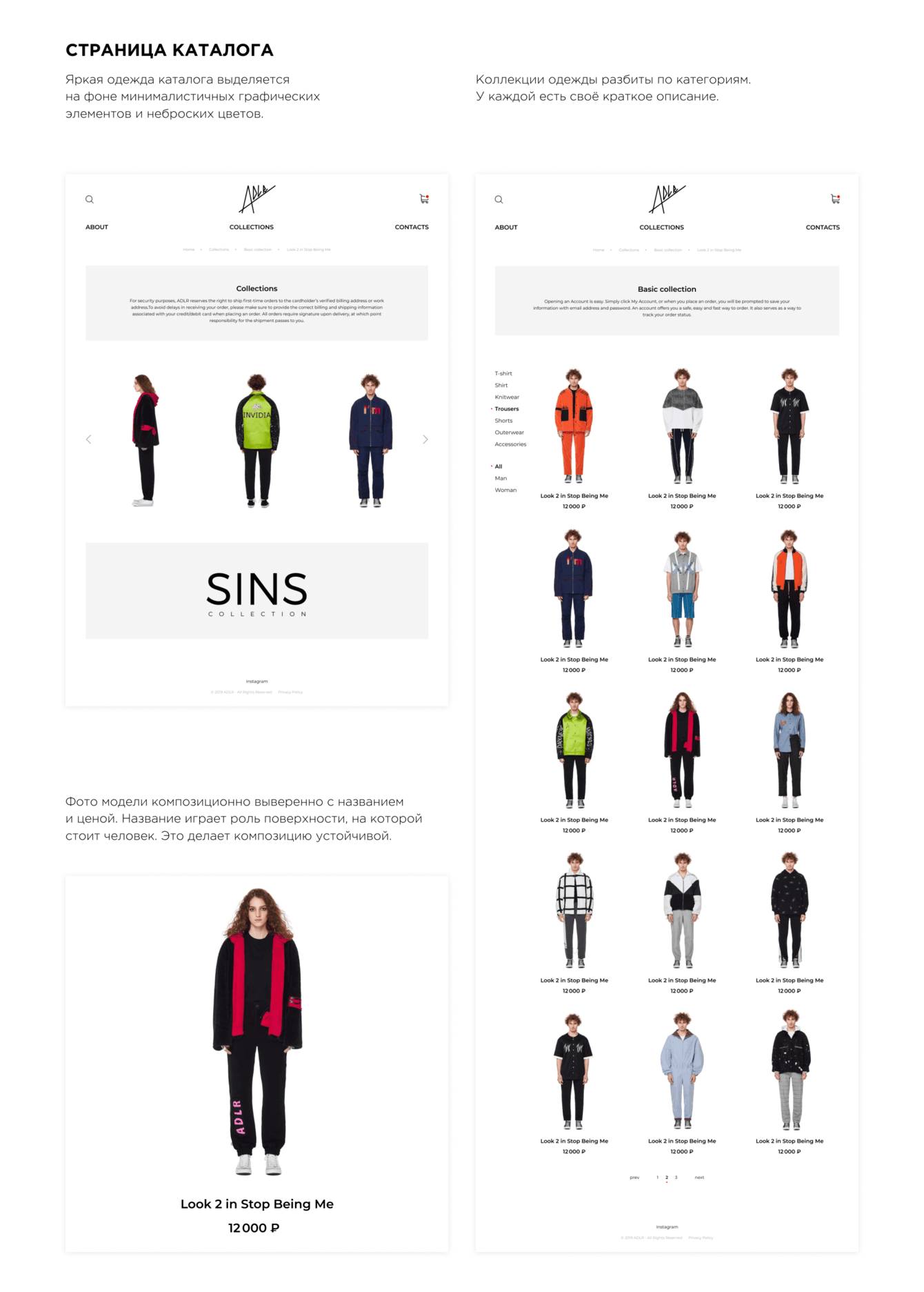 Мы решили использовать минимальное количество элементов графики и стилей цвета. Это позволило сделать акцент исключительно на продаваемой одежде.